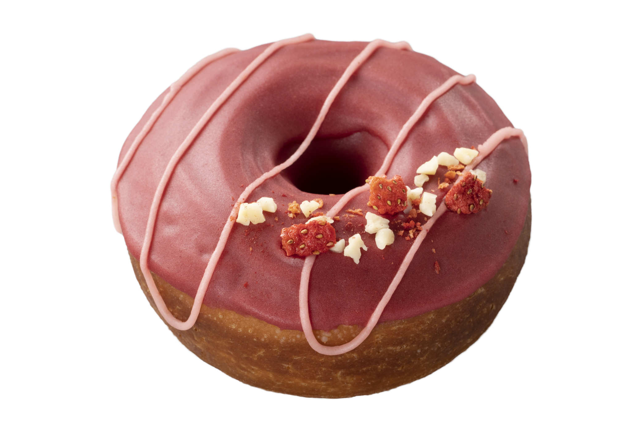 ストロベリーピューレの爽やかな味わいに、トッピングのフリーズドライストロベリーとダイスアーモンドが味と食感のアクセントになっています。素材の色を活かした鮮やかなピンクに、ストロベリーが香る淡いピンクのラインが映える華やかなドーナツです。