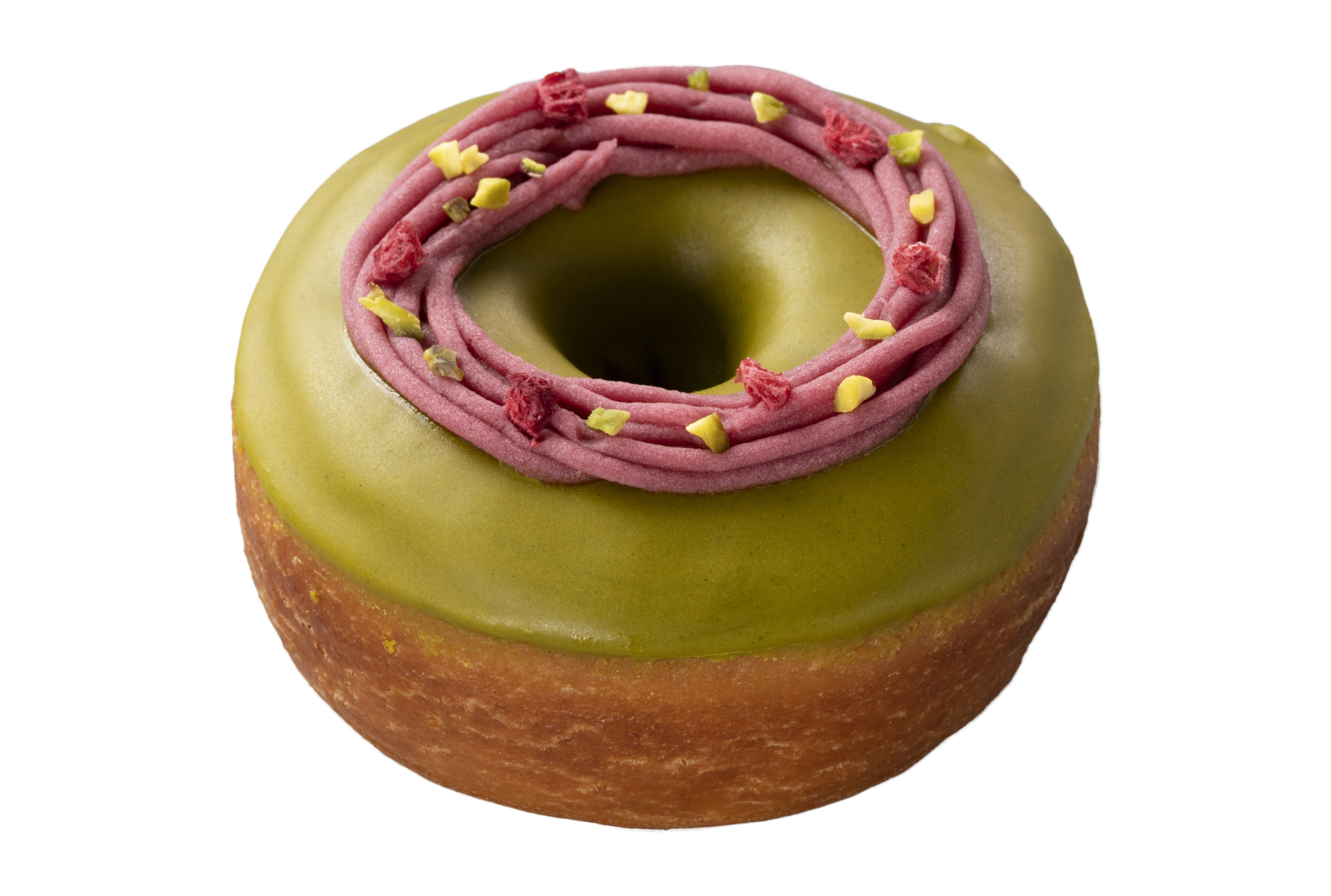 抹茶のほろ苦さや白あんの優しい甘み、フランボワーズの酸味の組み合わせで、奥行きのある味わいに仕上げました。若葉のようなグリーンのグレーズとピンクのあんに、トッピングのフリーズドライフランボワーズとピスタチオがアクセントのキュートで春らしい色味のドーナツです。