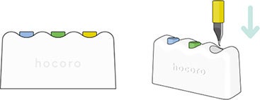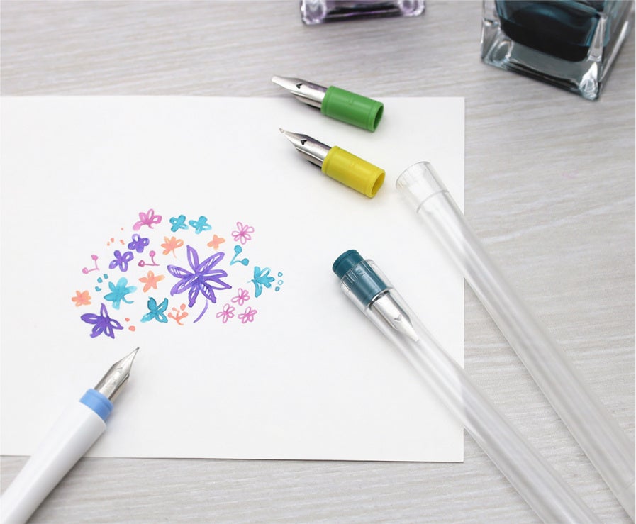「万年筆ペン先のつけペン hocoro」 は、ペン先を軽く水で流すだけで簡単に色替えができるので、インク交換の手間がなく、たくさんの色のインクを気軽に楽しめます。万年筆用ボトルインクを、より簡単手軽に利用できる万年筆ペン先のつけペンとしてこれまでに5種類のペン先〈細字・中字・1.0mm幅・ 2.0mm幅・筆文字〉と、ペン先のカスタムパーツとして、より多くのインクを保持するリザーバーパーツ単体を発売いたしました。
