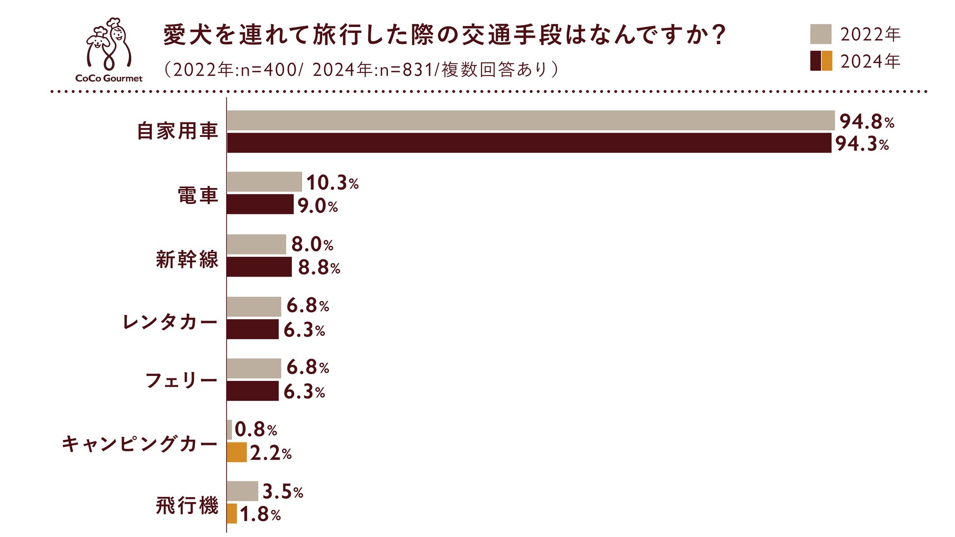 愛犬と旅行した際の交通手段は1位自家用車、2位電車、3位新幹線と前回調査と上位は同じだったが、飛行機が前回調査より1.7%減り、キャンピングカーが1.4%増え順位が逆転した