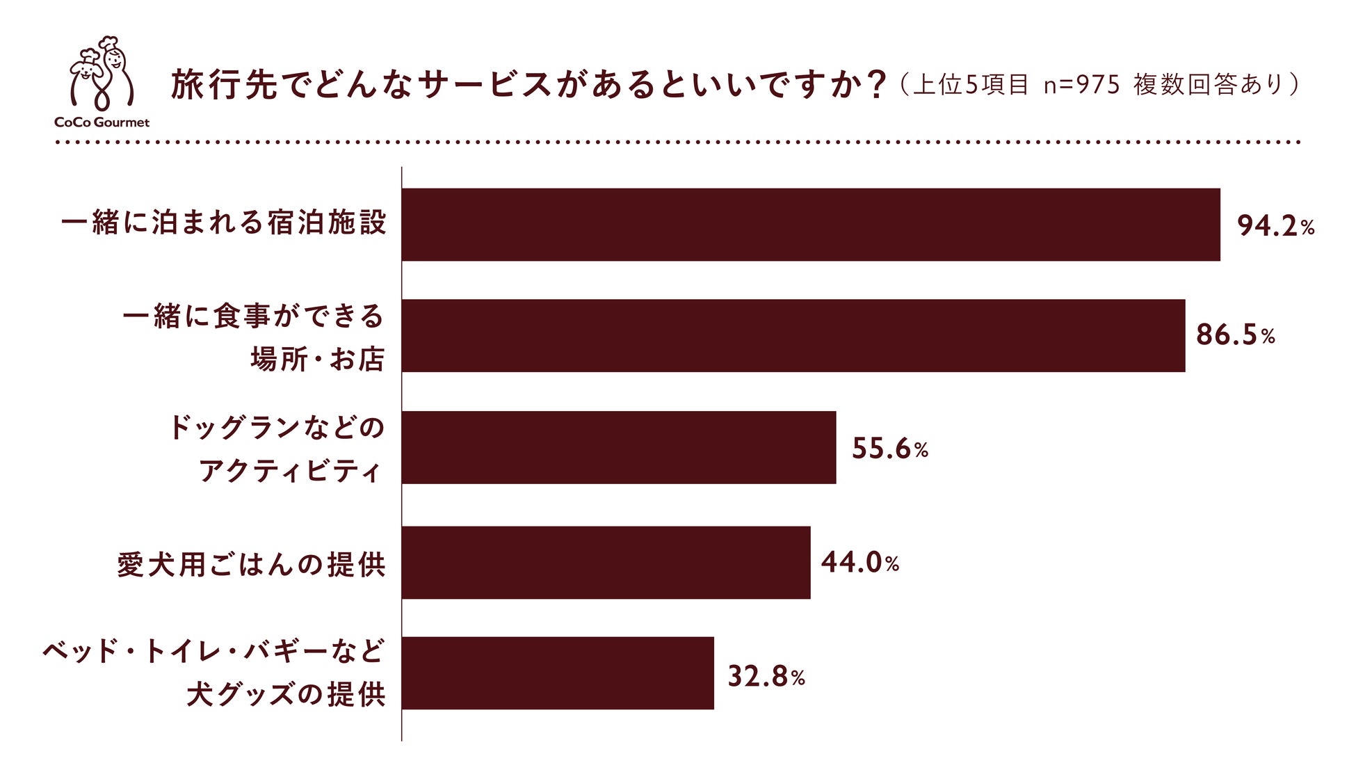 愛犬との旅行意向のある飼い主が旅行先で欲しいサービスは「一緒に泊まれる宿泊施設」94.2%、「愛犬と一緒に食事ができる場所・お店」86.5%であり、他サービスより30%以上高かった。