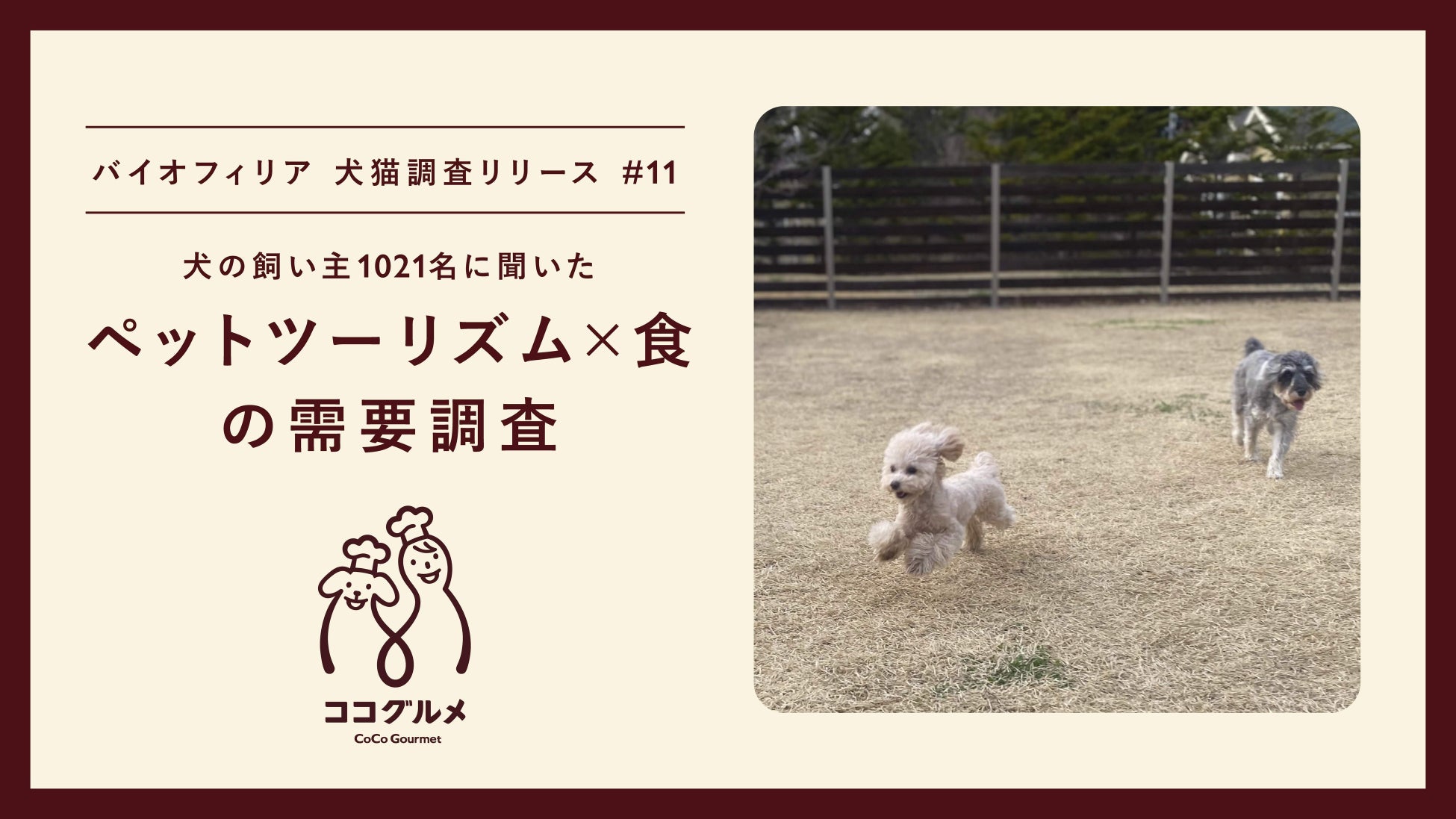 フレッシュドッグフード(※1 )売上2年連続No.1(※2)のフレッシュペットフード「CoCo Gourmet(以下:ココグルメ)」を開発・販売するスタートアップ、株式会社バイオフィリア(本社:東京都新宿区、代表:岩橋洸太、以下:当社)は、昨今盛り上がりをみせる「ペットツーリズム」に関する実態調査を全国の犬と暮らす飼い主さま1,021名を対象に行いました。(調査期間:2024年10月24日(木)〜28日(月))