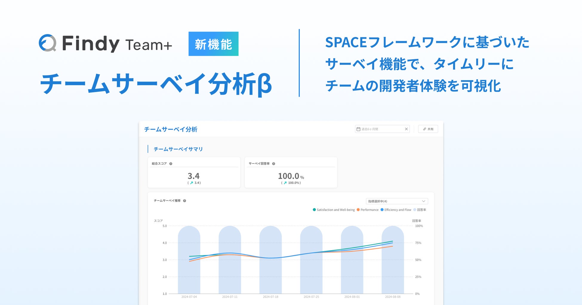 エンジニアプラットフォームを提供するファインディ株式会社(東京都品川区、代表取締役:山田 裕一朗、以下「当社」)は、エンジニア組織支援SaaS「Findy Team+(チームプラス)」に「チームサーベイ分析β」機能を追加したことを発表します。β版では、「SPACE」フレームワークに基づいたサーベイを通じて、開発チームの開発者体験における課題を多面的に可視化し、エンジニアの開発生産性向上をサポートします。
