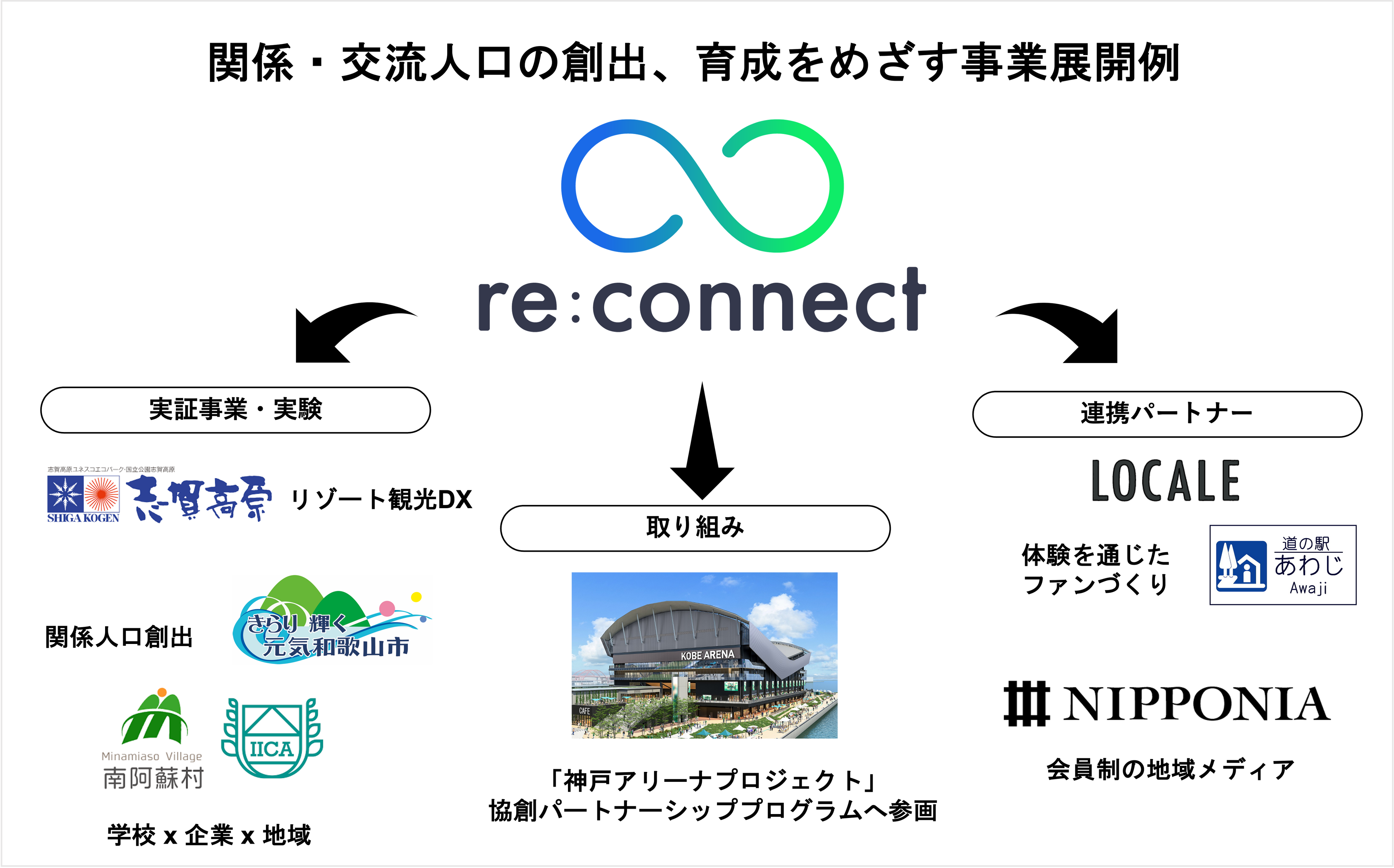 当社は「Create Synergy with FAN」というミッションのもと、 re:connect事業により行政・企業・ファンが一体となって、地域が持続的に成長できる仕組みづくりをお手伝いします。本事業では、観光庁に採択された地域観光DXの実証実験など、複数のプロジェクトに参画し実効性や汎用性の検証を行っています。