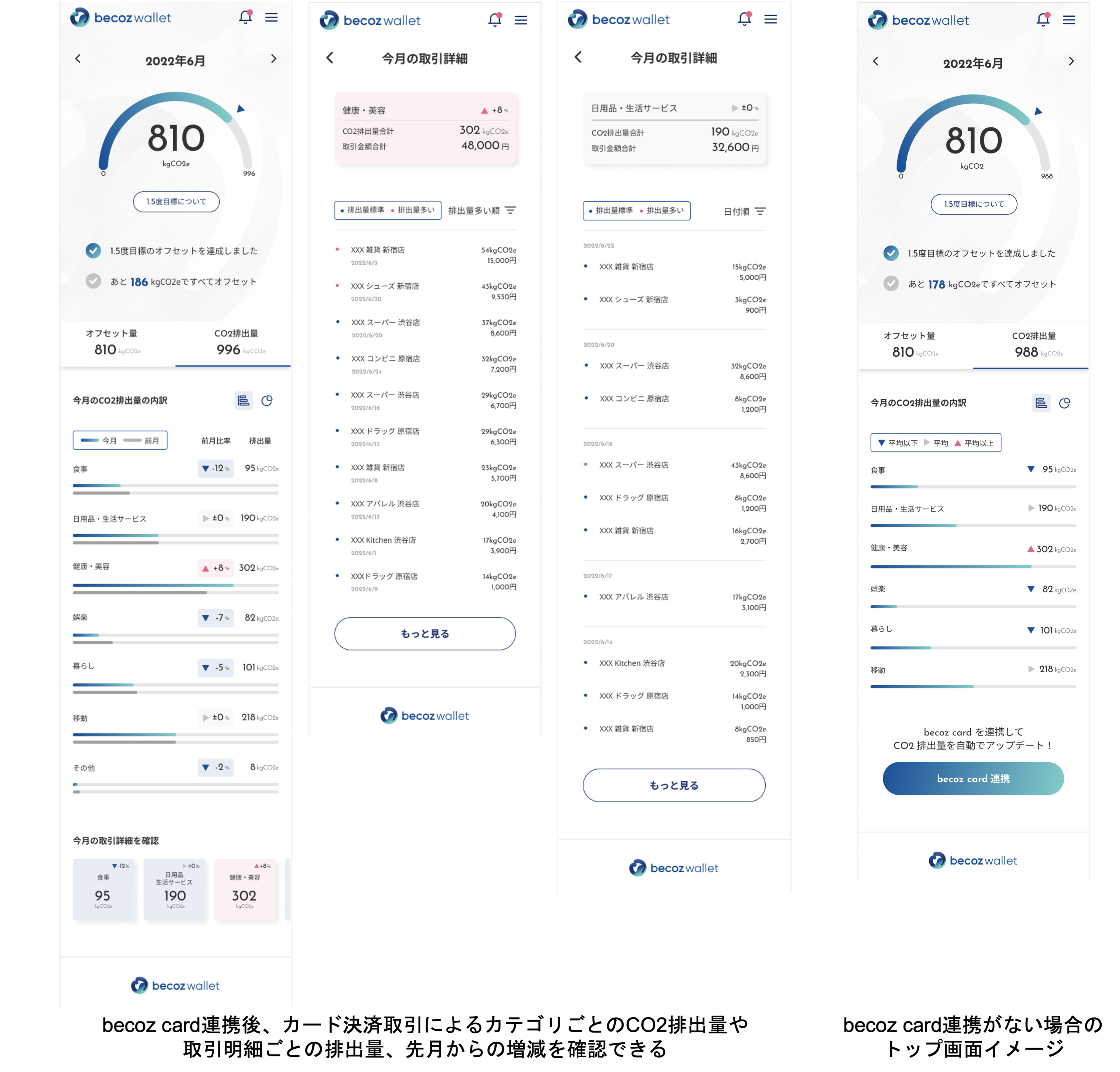 「score」機能では、Verison 1.0においてはユーザーの入力するアンケート回答およびクレディセゾンと発行する「becoz card」との連携により、クレジットカードの決済データからCO2排出量を可視化することができます。