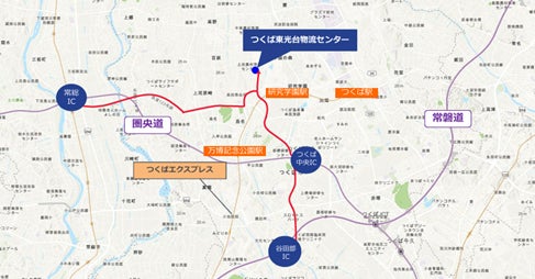 つくば東光台物流センターは、圏央道「つくば中央 IC」出入口から約5km、常磐自動車道「谷田部 IC」出入口から約9kmに位置し、関東全域への配送や東京都心まで車で約1時間で配送可能な立地にあります。 また、設備は、荷物用エレベーター2基に加え、垂直搬送機4基が備わっており迅速な運用をサポートしているほか、梁下有効高5.5m、床荷重1.5t/㎡、高床式バース、ドッグレベラー4基設置という基本スペックを有しています。