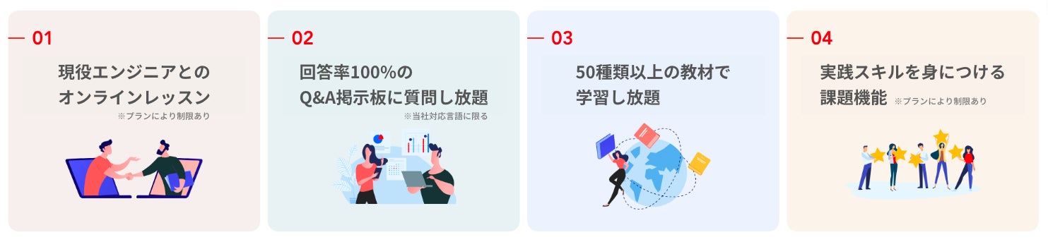 IT研修の必要性を感じながらも、グループ研修での外部講師委託費や教材導入費、レッスン設備投資等がネックとなり、IT研修をなかなか開始することができないという声をいただいておりました。侍テラコヤでは、そんな課題を抱えるたくさんの企業が、より手軽に、より確実にスキル習得を目指せるよう、法人プランで充実した研修サポートを提供しています。