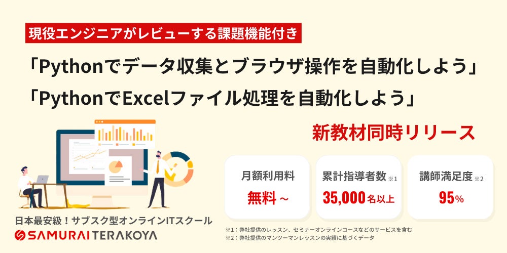 株式会社SAMURAI(本社所在地:東京都千代田区、代表取締役 :高比良 直人)は、運営するサブスクリプション型プログラミングスクール「侍テラコヤ」にて、新教材「Pythonでデータ収集とブラウザ操作を自動化しよう」と「PythonでExcelファイル処理を自動化しよう」を同時リリースしました。