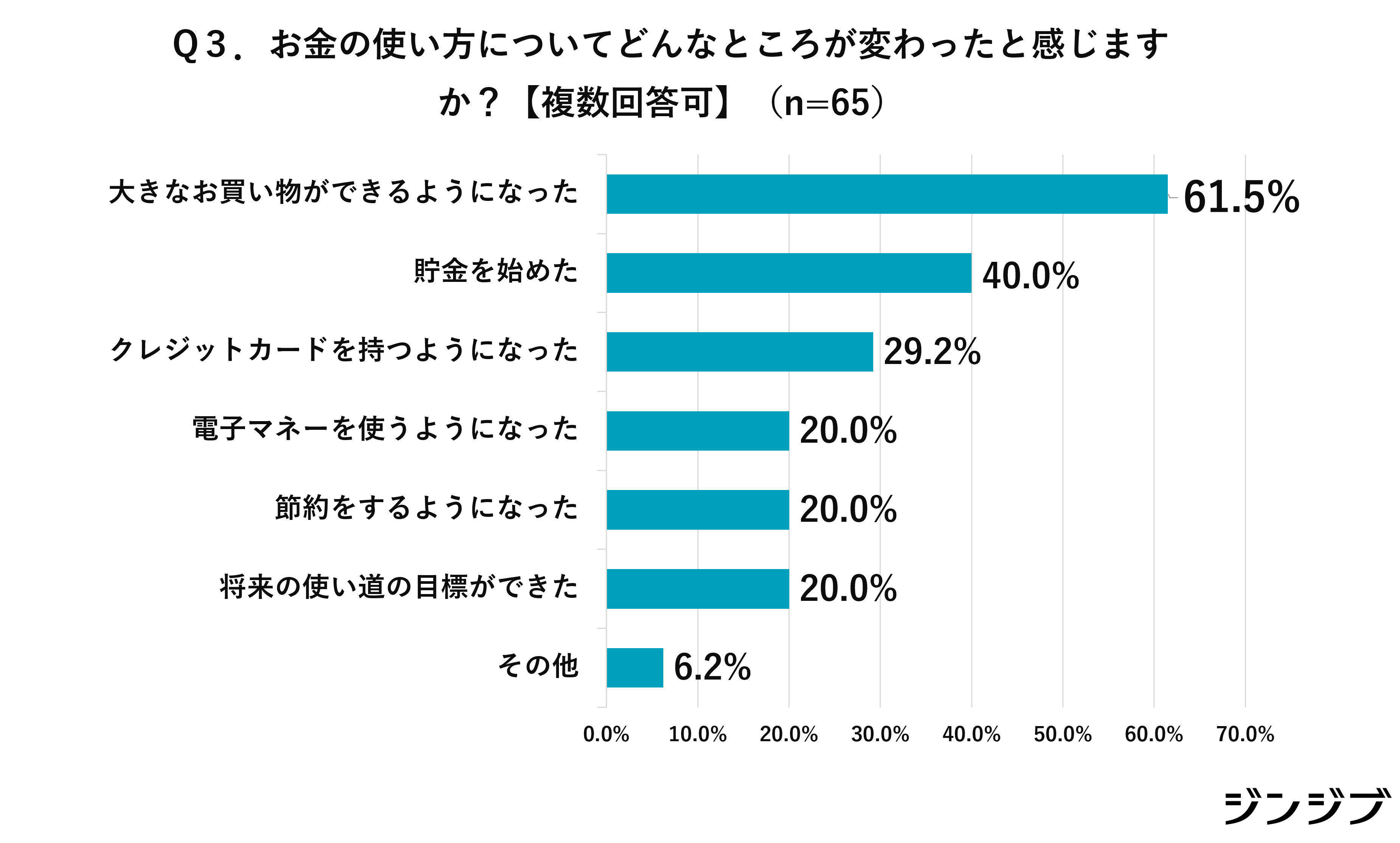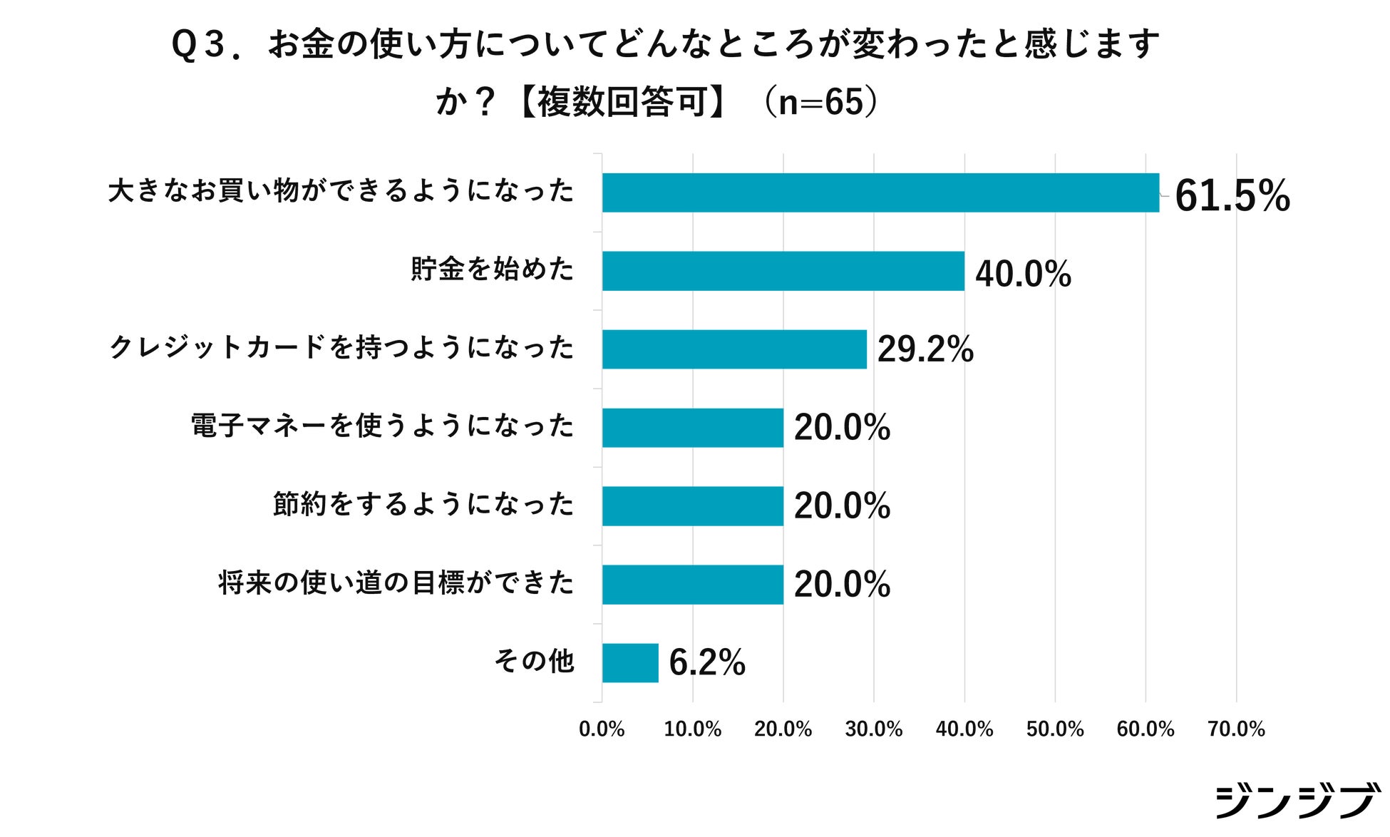 Q2で「変化があった」と回答した方へさらに、お金の使い方について、どんなところが変わったと感じるかを聞いたところ、最も多い回答は「大きなお買い物ができるようになった」(61.5%)でした。社会人となり、学生の頃のお小遣いやアルバイト代とは違い、収入が増加したことにより「大きな買い物ができるようになった」と感じる高卒社会人が多くみられました。