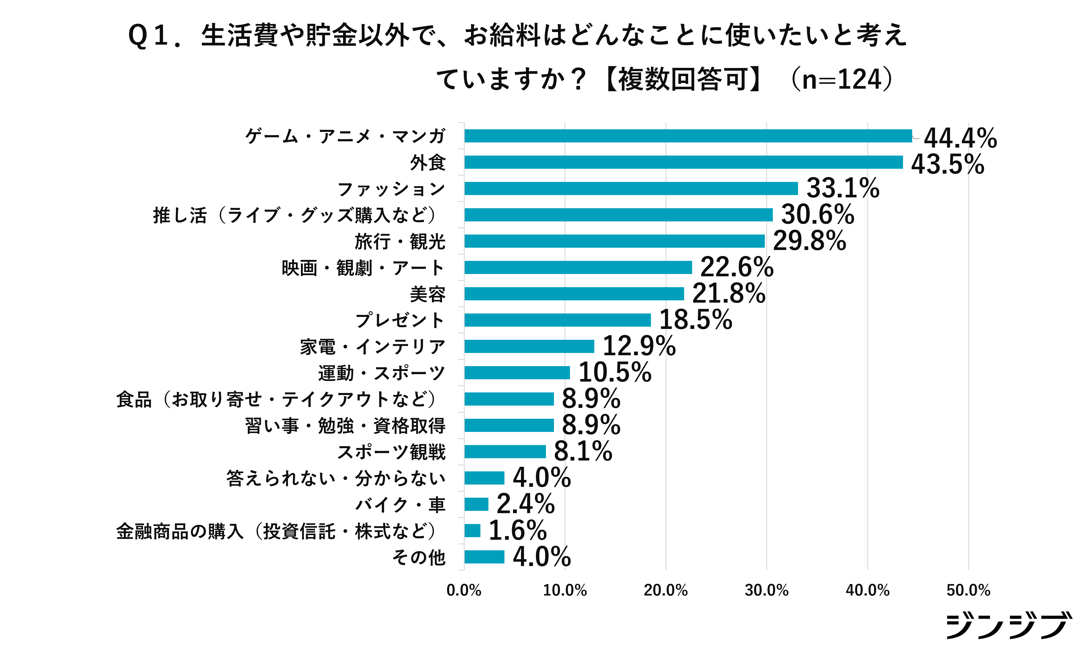 生活費や貯金以外で、お給料をどんなことに使いたいかについて聞いたところ、1位は「ゲーム・アニメ・マンガ」(44.4%)でした。2位「外食」(43.5%)、3位「ファッション」(33.1 %)、4位「推し活(ライブ・グッズ購入など)」(30.6%)と、上位には自分自身の楽しみや生活の質を向上させることに重点を置いていることがわかります。