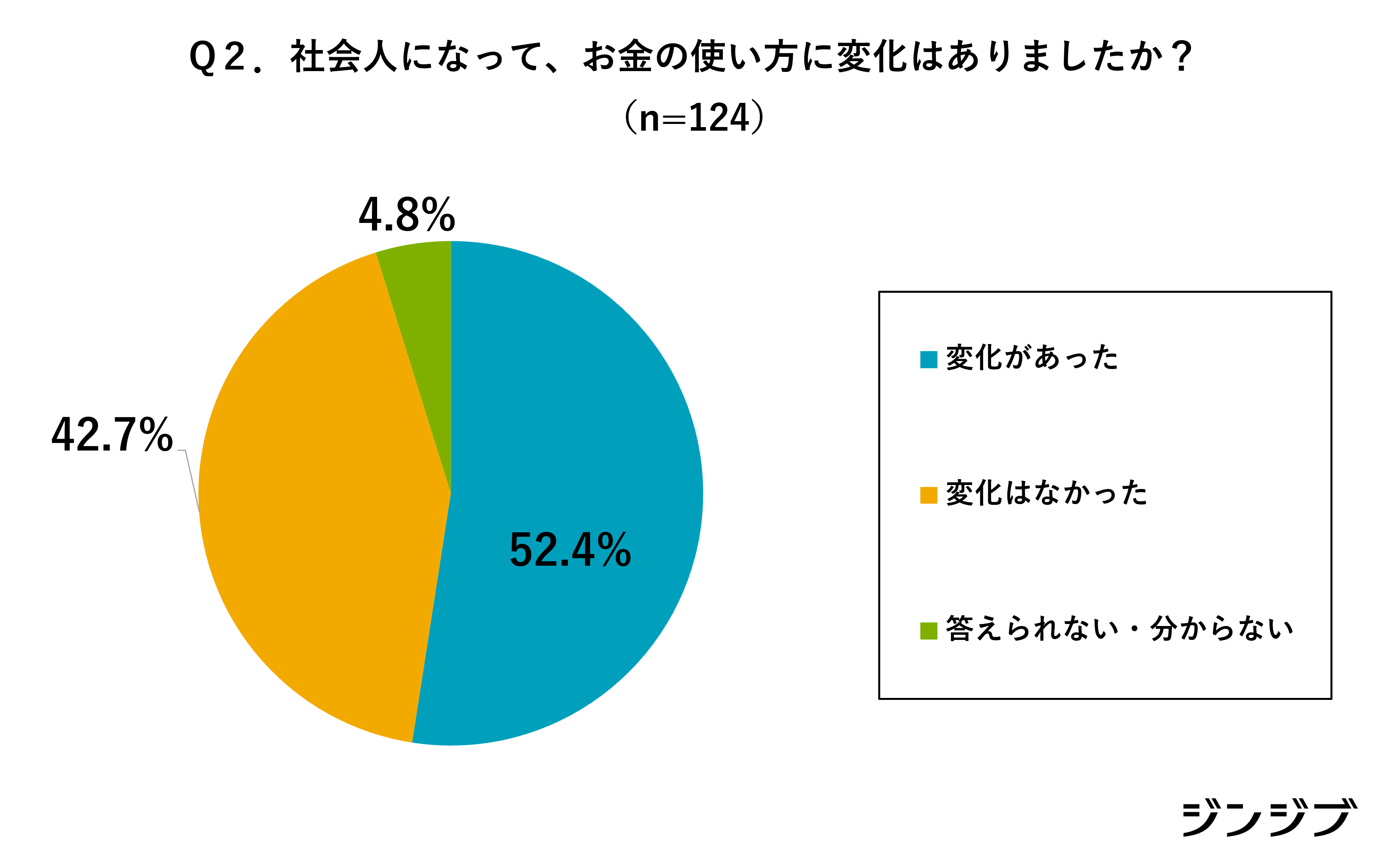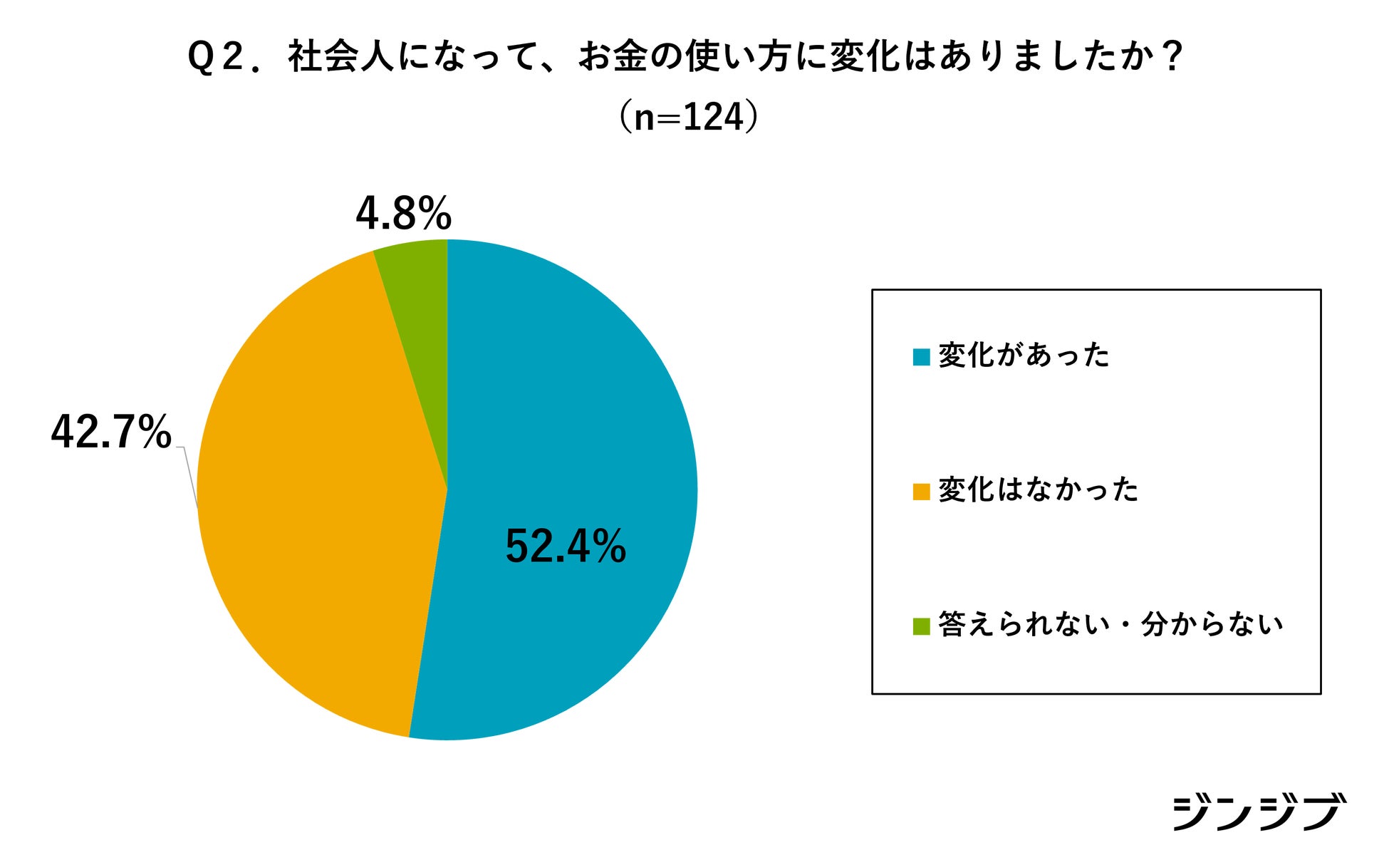 社会人になってお金の使い方の変化について聞いたところ、約半数の52.4%が、「変化があった」と回答しました。