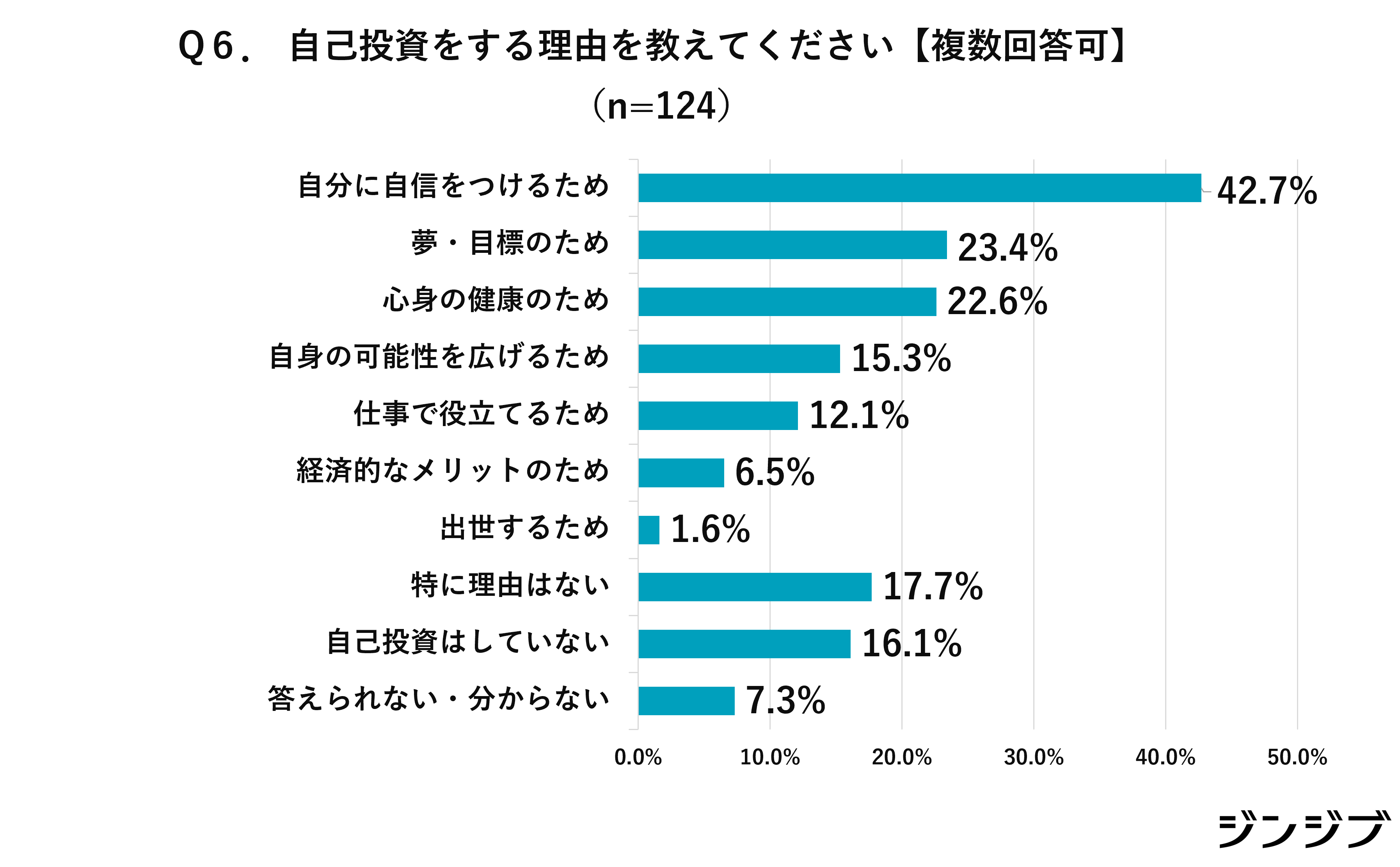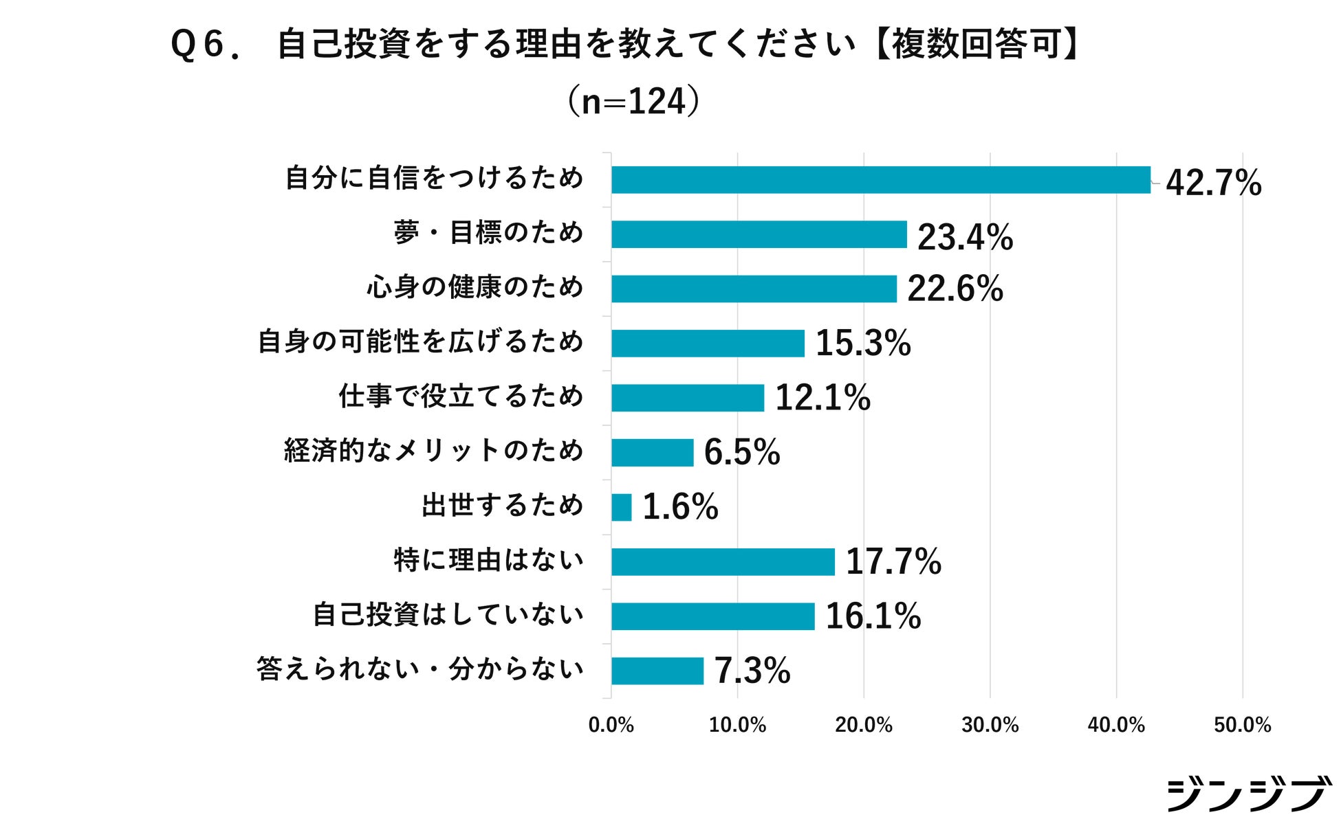 さらに自己投資をする理由について聞いたところ、「自分に自信をつけるため」(42.7%)と最も多く、続いて「夢・目標のため」(23.4%)、「心身の健康のため」(22.6%)という結果になりました。経済的なメリットや出世するためではなく、自分自身の気持ちの向上のために自己投資をするという意識が強いことがわかります。