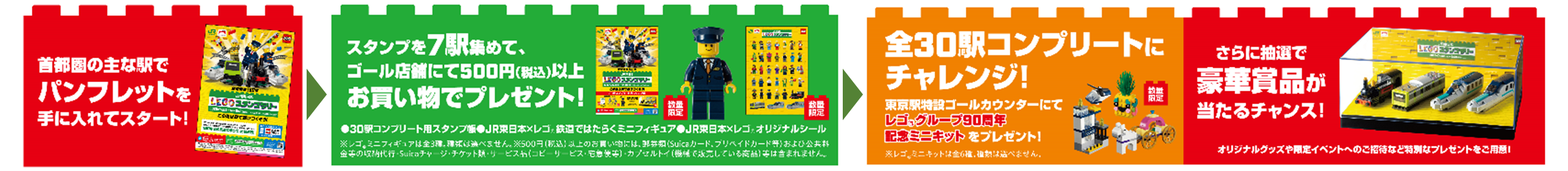 7駅のスタンプを集め、ゴール店舗に指定されたNewDays(10店舗)にパンフレットをお持ちいただき、500円(税込)以上お買い物いただくと、「JR東日本×レゴ®鉄道ではたらくミニフィギュア」(全3種)、「30駅コンプリート用スタンプ帳」、「JR東日本×レゴ®オリジナルシール」をプレゼントします。(数量限定でお一人様1セットずつといたします)