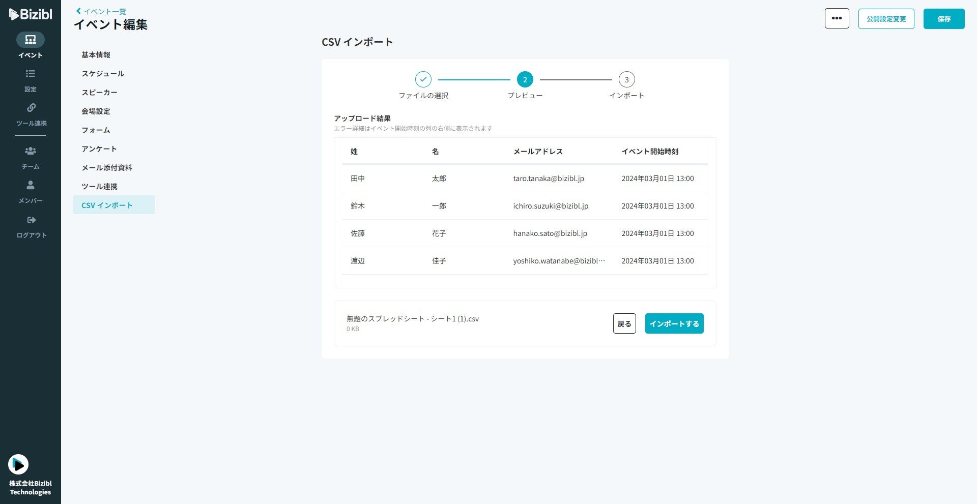 ・ファイルの選択が完了すると、インポート(≒ 申し込み者情報の登録完了)前に、取り込んだCSVデータをプレビューで確認することができます