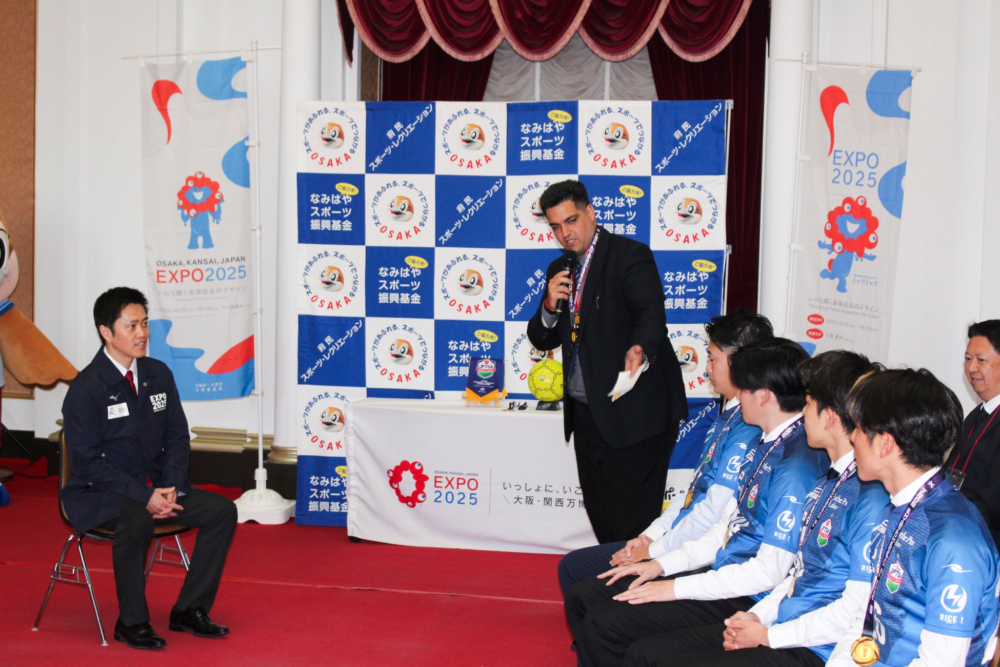 吉村知事から「ソサイチに夢中になったキッカケ」を聞かれたNo.8 箱崎 裕也選手(ソサイチ関西リーグVOLVER OSAKA所属)は、「2024年5月の全国大会をキッカケに一気に火が付いて、代表を目指したいと思うようになりました」と回答し、No.26 圓乘 健介選手(ソサイチ関西リーグプラムワン所属)からは、「2023年のメキシコで行われた世界大会では悔しい思いをした、8月のブラジルで行われる世界大会で悔しさを晴らしたい、まずはメンバーに選ばれるように頑張ります」と決意表明がありました。