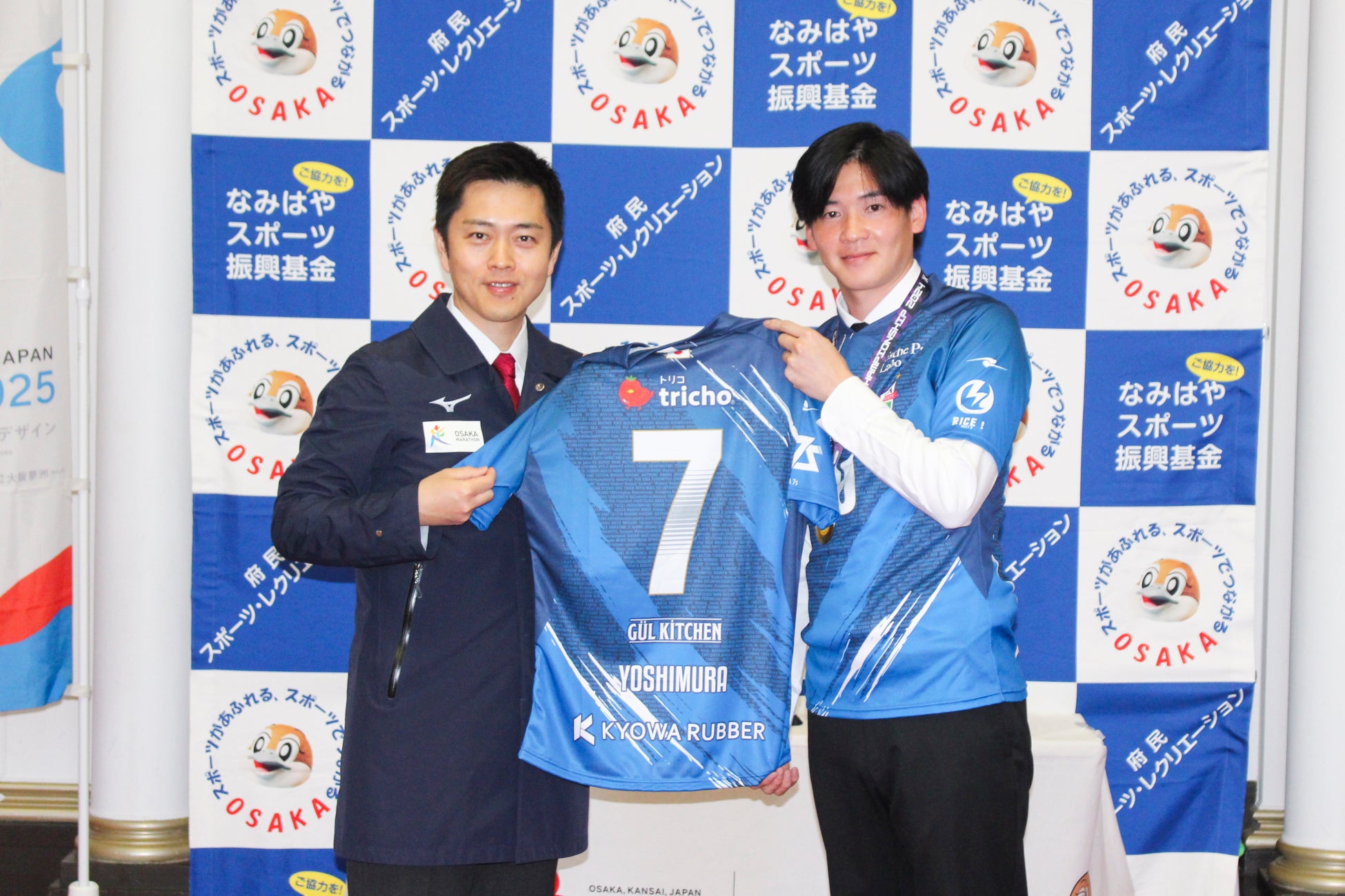 大阪府庁より、No.10 縣 翔平選手(ソサイチ関西リーグプラムワン所属)へ記念品をいただき、またソサイチ日本代表からは吉村知事のお名前「YOSHIMURA」入りのユニフォームを贈呈させていただきました。