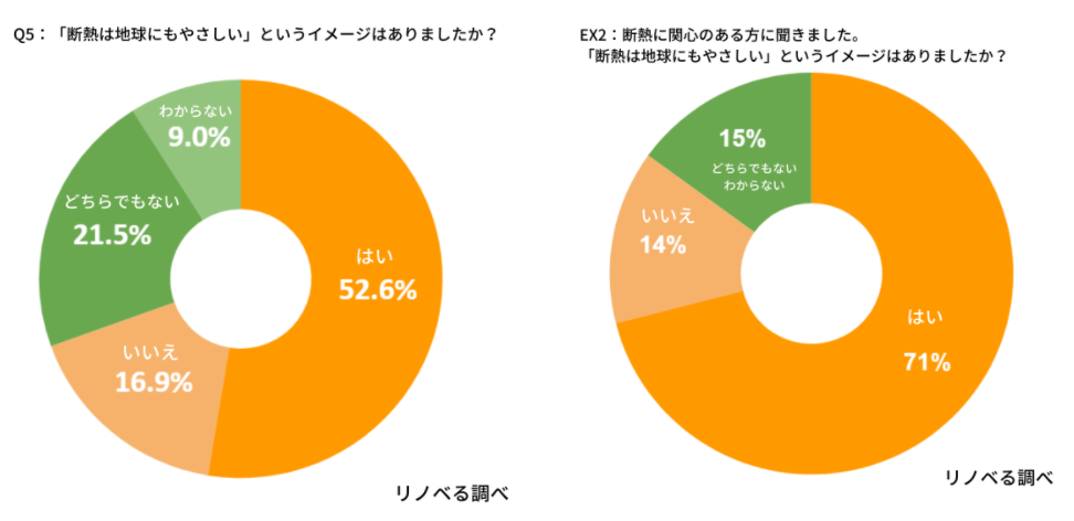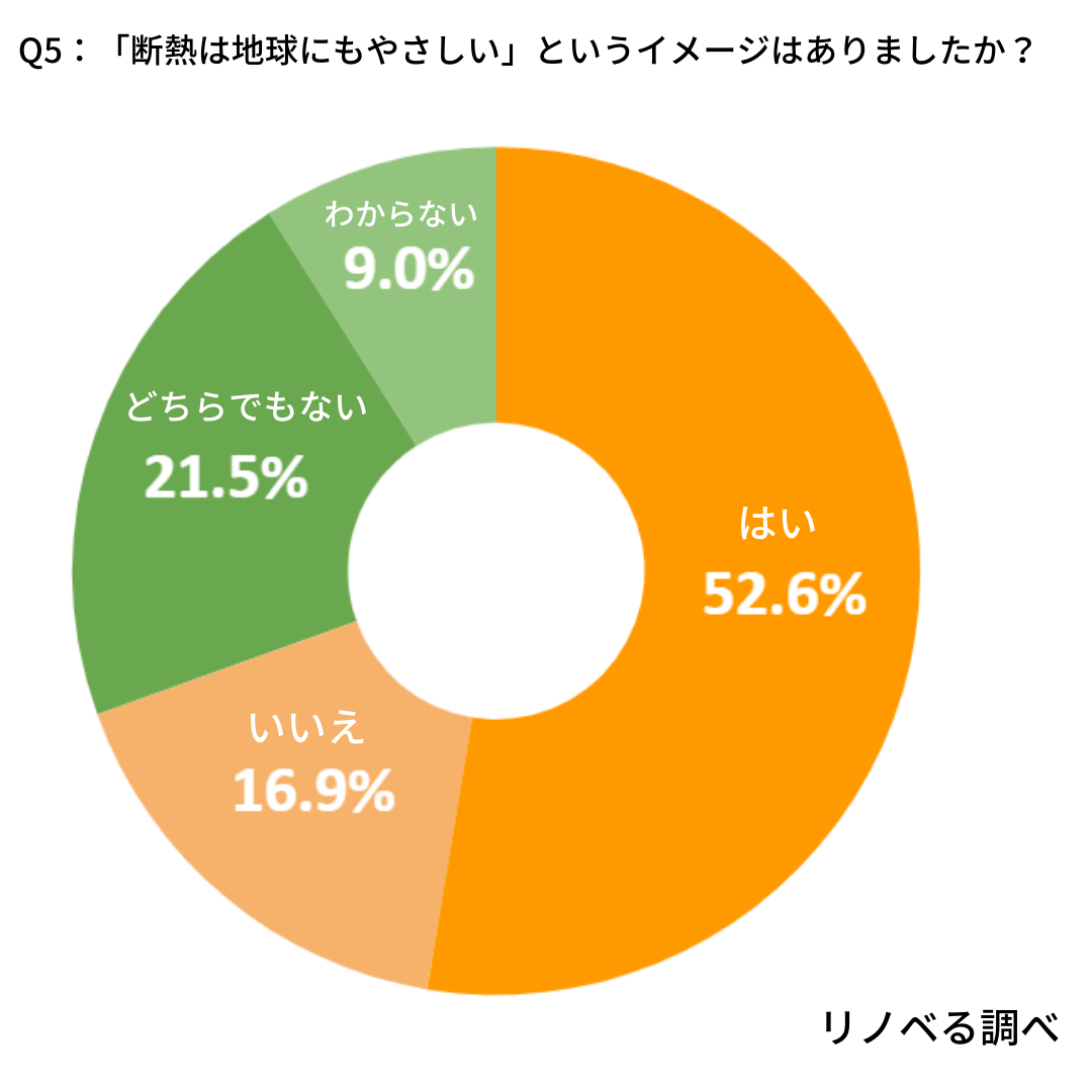 Q3で断熱が環境と紐づいてイメージしている方は3割に留まる結果となりましたが、「断熱は地球にやさしい」というイメージを持っている人はどの程度いるのでしょうか。
