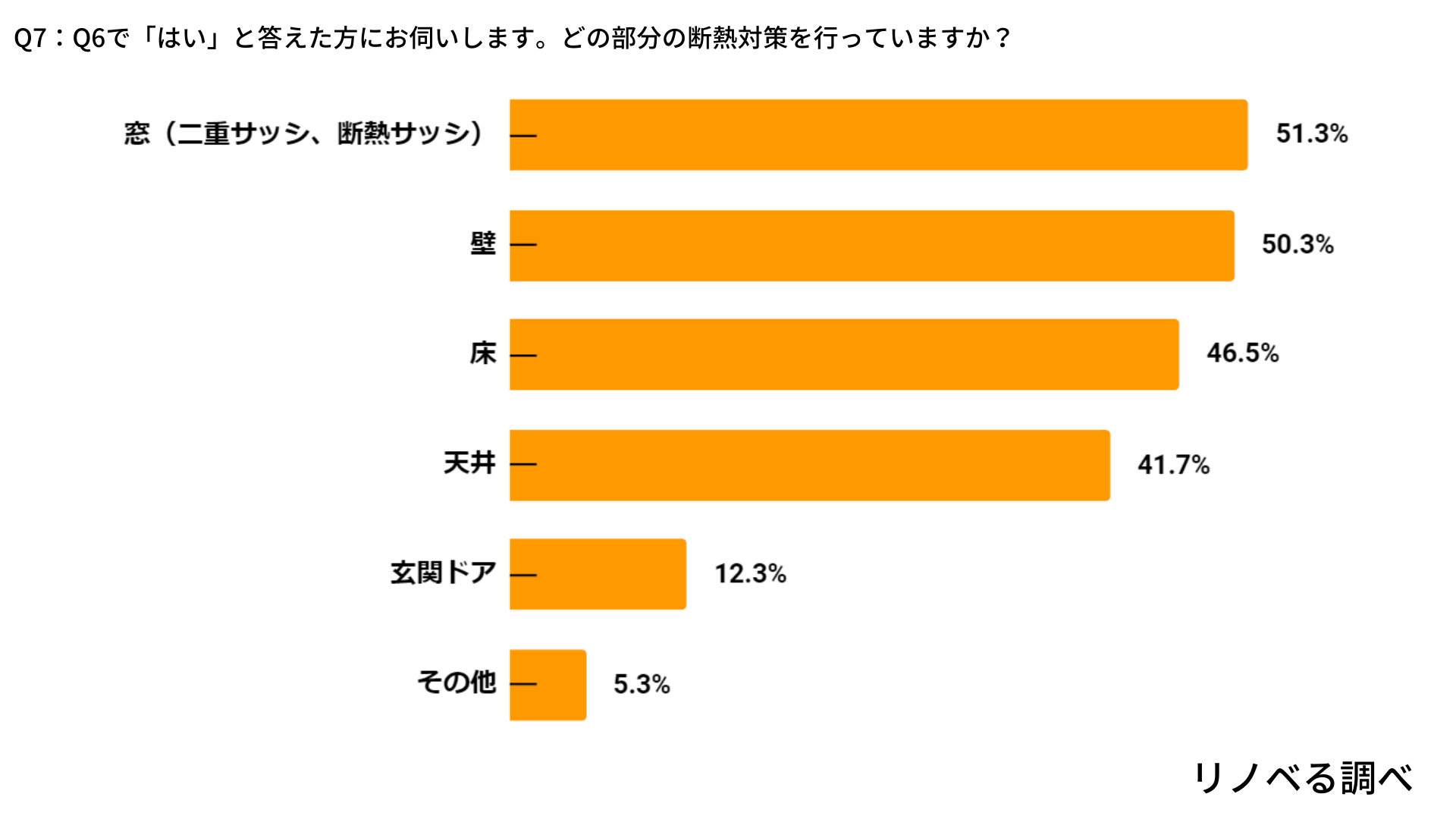 1年が経過して、断熱対策を実施した箇所を聞いたところ、僅差ではありますが「窓」が1位となりました。住まいへの関心が高まり、メーカーや様々な団体による「窓」の断熱効果や断熱方法に関する発信等が増えたことにより、認知が進んだと考えられそうです。2020年の調査(https://renoveru.co.jp/news/4383/)