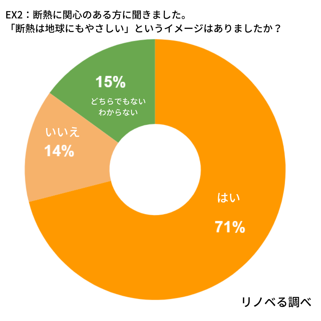 一方で、断熱に関心のある方のうち71.6%が「断熱=地球に優しい」というイメージを持っていました。断熱の効果を知れば知るほど、「断熱」と「地球環境」がつながるという結果となりました。