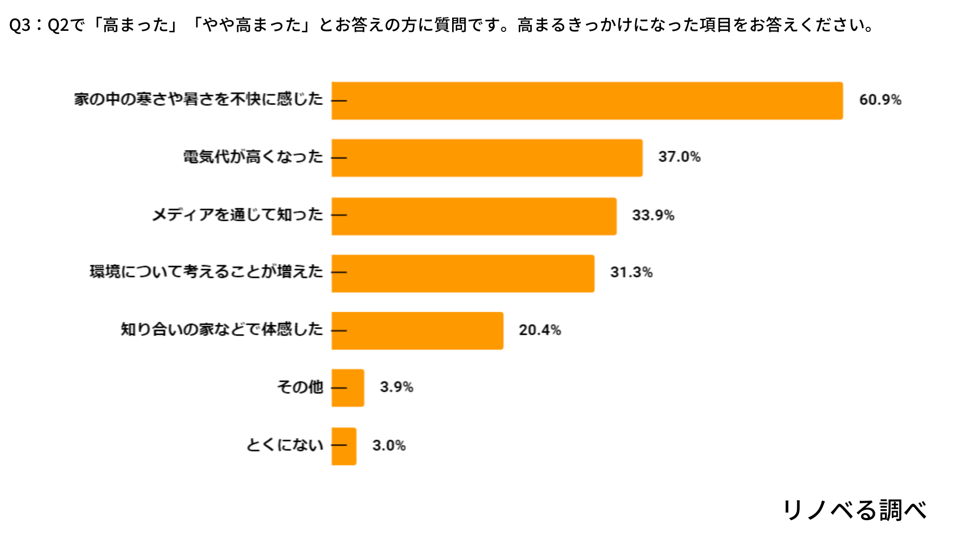 コロナ禍で自宅にいる時間が増え、今まで気づかなかった住まいの不満を感じる方も多かったのではないでしょうか。Q2で断熱に対する関心が「高まった」「やや高まった」と回答した方に対して関心が高まったきっかけを聞いたところ、「家の中で寒さや暑さを不快に感じた」が圧倒的1位となりました。同様に、自宅にいる時間が長くなり電気代が上がったことや、昨今の電気代高騰も影響し、費用の面からも断熱を意識し始めた方も多くいらっしゃいました。一方で、近年世界的な課題となっている「地球環境」と「断熱」を紐づけて考えた方は約3割に留まる結果となりました。