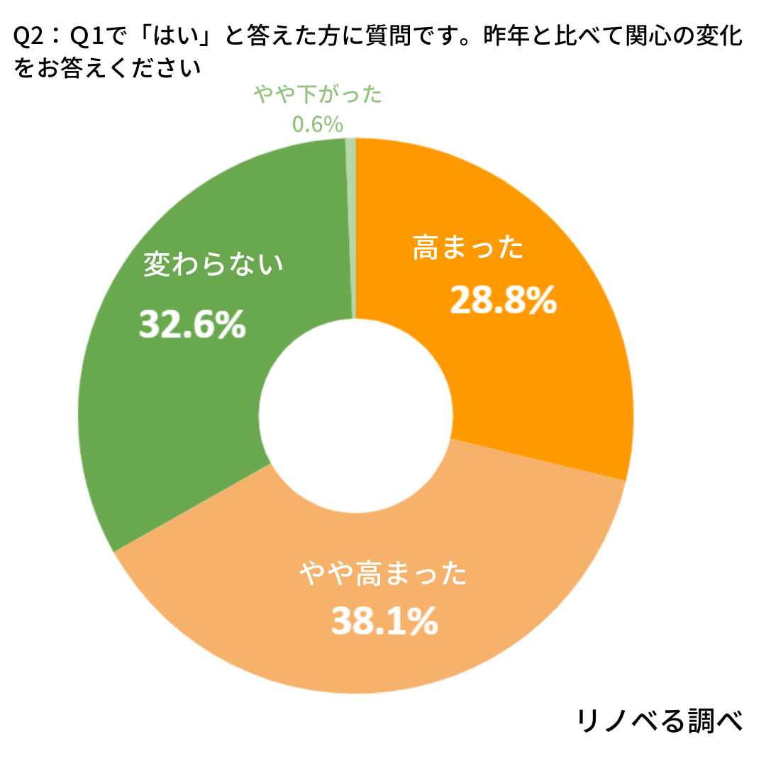 関心ありと答えた方の66.9%(「高まった」と「やや高まった」の合計)が昨年よりも関心が高まってるという結果となりました。