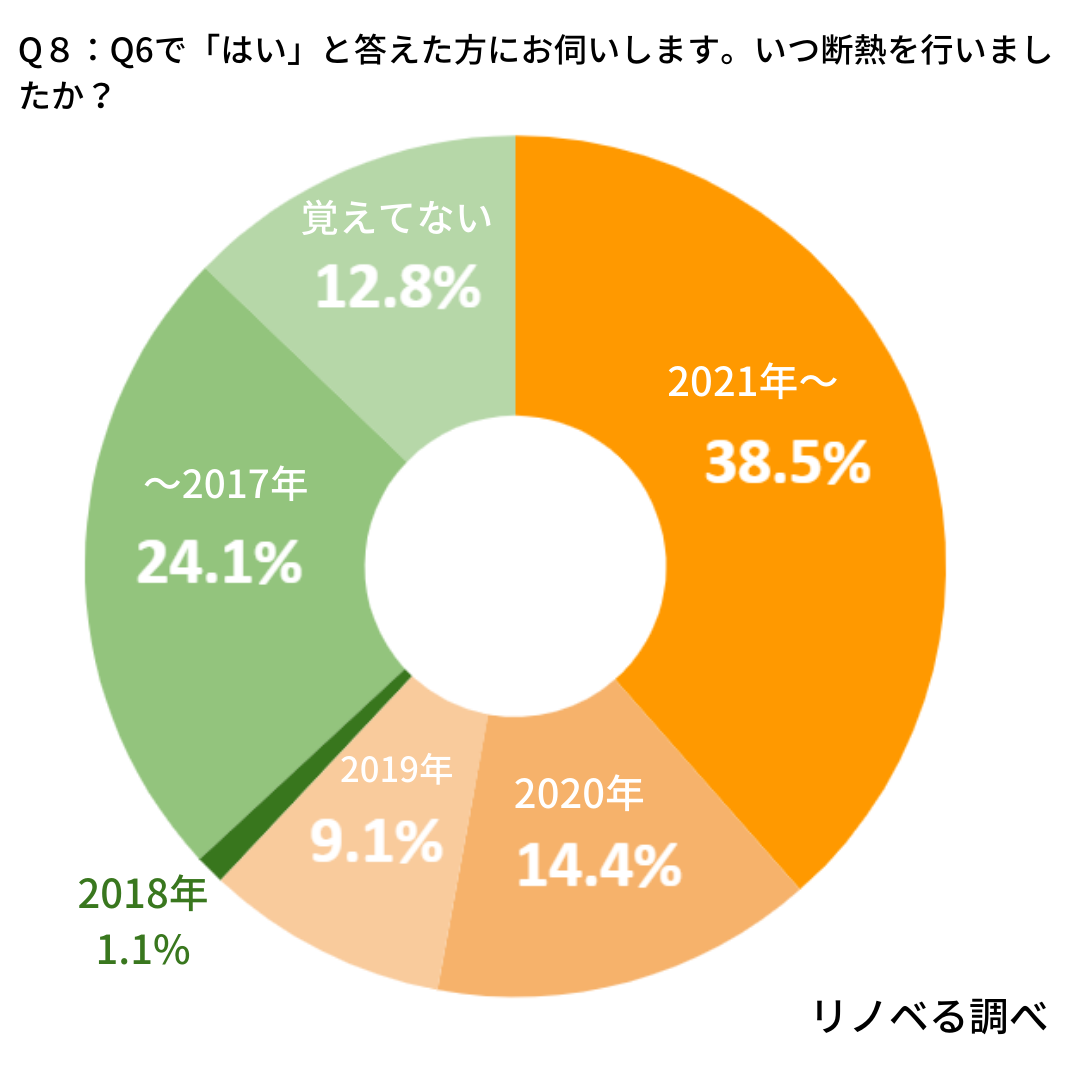 現在断熱を行っている方に対して断熱対策の実施時期について聞いたところ、コロナ禍以降(2020年~)に断熱を実施した人が約半数の53%にも上りました。これはコロナ禍において在宅の時間が増え、以前より断熱に関心を持っていた方の家に対する関心がより高まり、実際に断熱を実施するに至ったと考えられます。