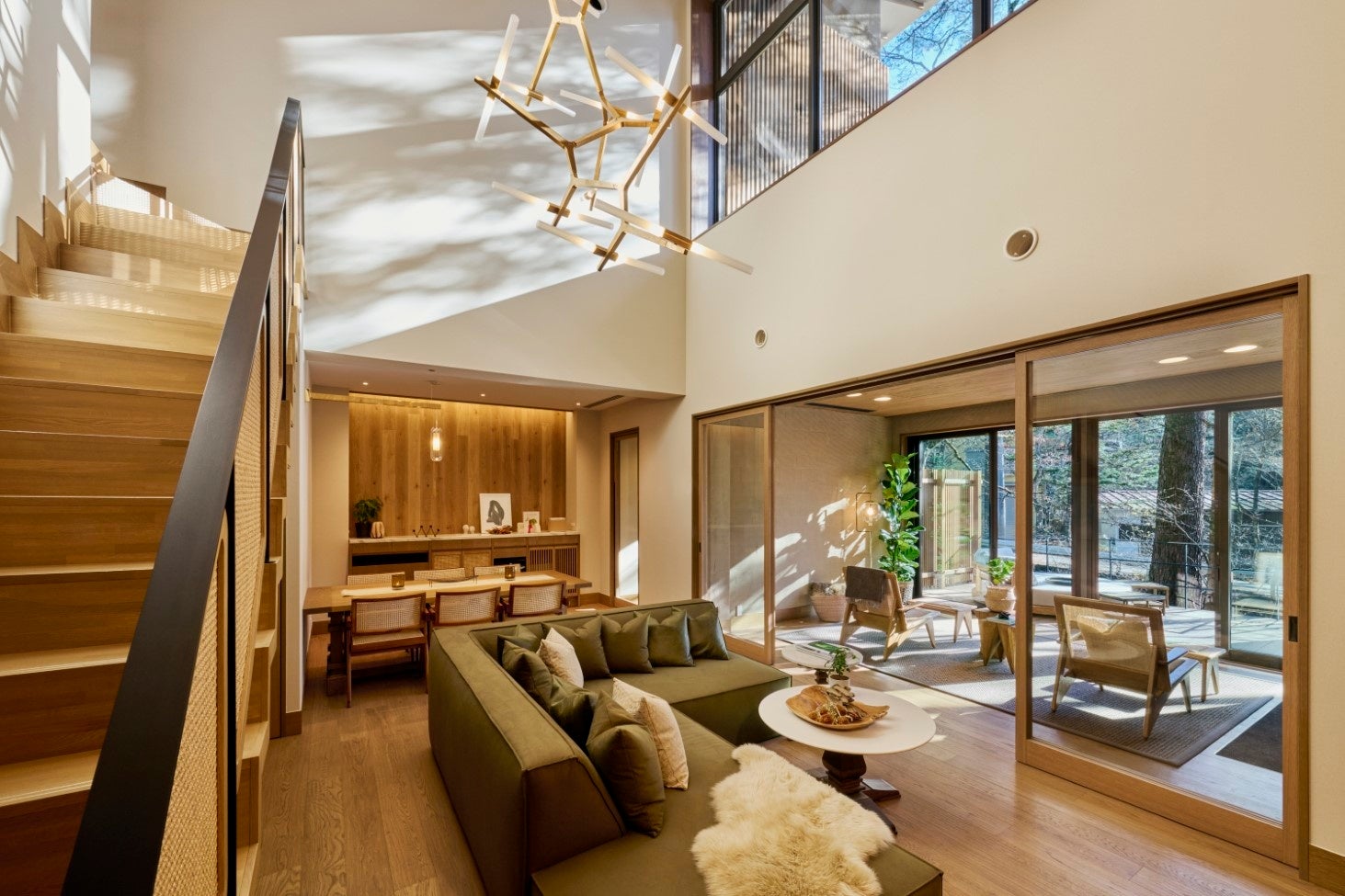 GLAMDAY STYLE HOTEL SUITEは全7部屋すべてに、広々としたリビングダイニングと、バスルーム・ベッドルームを2つずつ備えており、ご家族やグループでの滞在に最適です。また、バスルームにはサウナも完備しており、隣接したテラスでの外気浴とともに、心身を整える時間をプライベート空間でご堪能いただけます。オープンリビングを設えたお部屋では、四季により様々な過ごし方をご提案いたします。夏は外気を取り込む開放的な空間で過ごすテラス、冬は薪ストーブを囲む空間として、大自然を身近に感じながらお過ごしください。