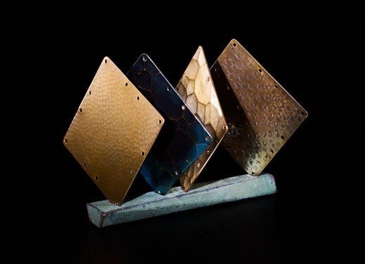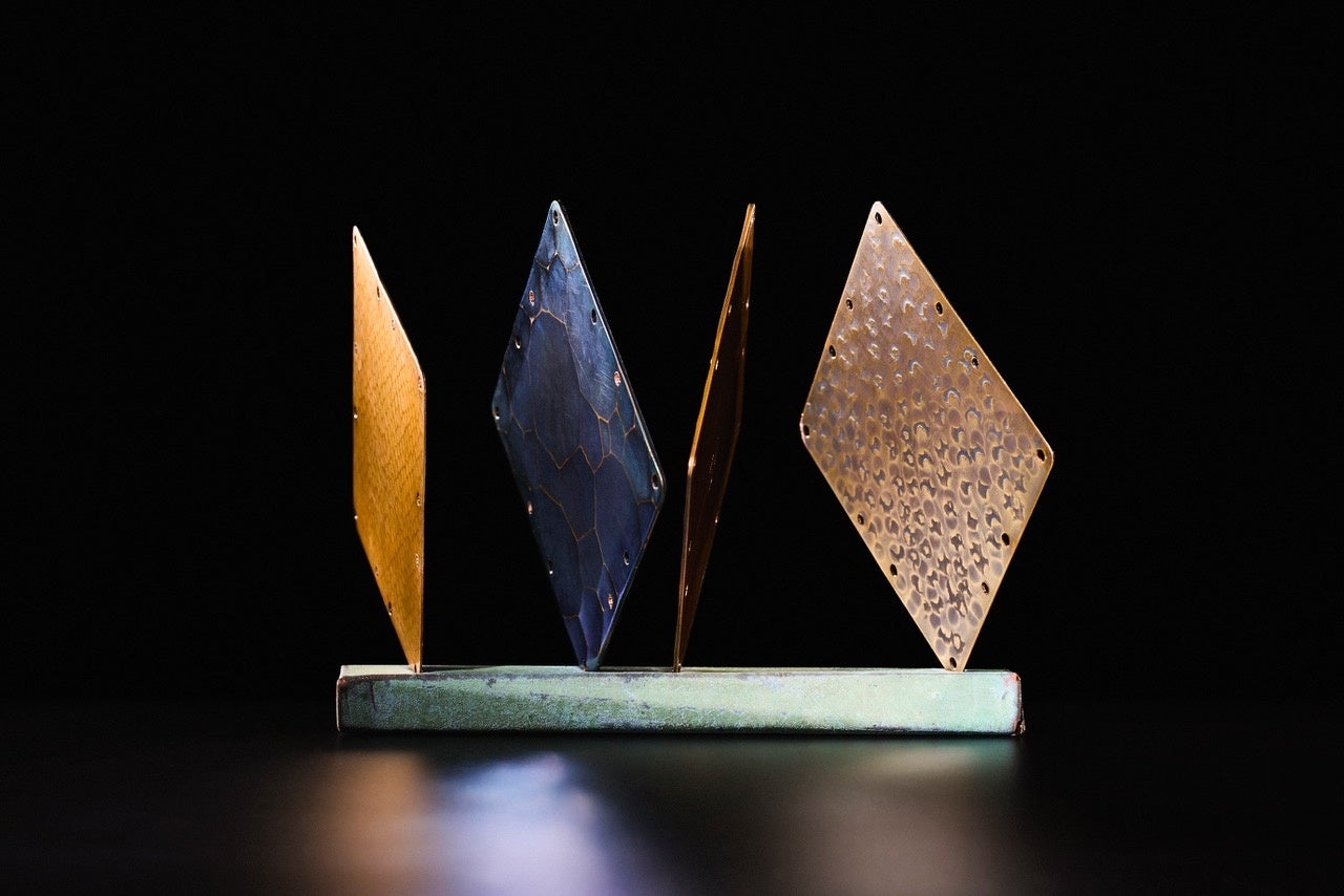 宇宙空間に被曝した板金4枚を使って、小さな宇宙を表現しました。あらゆる方向にパラパラと傾いた銅板が様々に反射し、宇宙で焼き付いた表面の色、素材の変化を楽しむことができます。緑青銅板で巻かれた土台の上に微妙なバランスで固定された銅板は、無重力に浮かぶ不安定な物質を表現し、目線の高さや見る方向によって見え方が異なる、繊細でマジカルなオブジェとなりました。