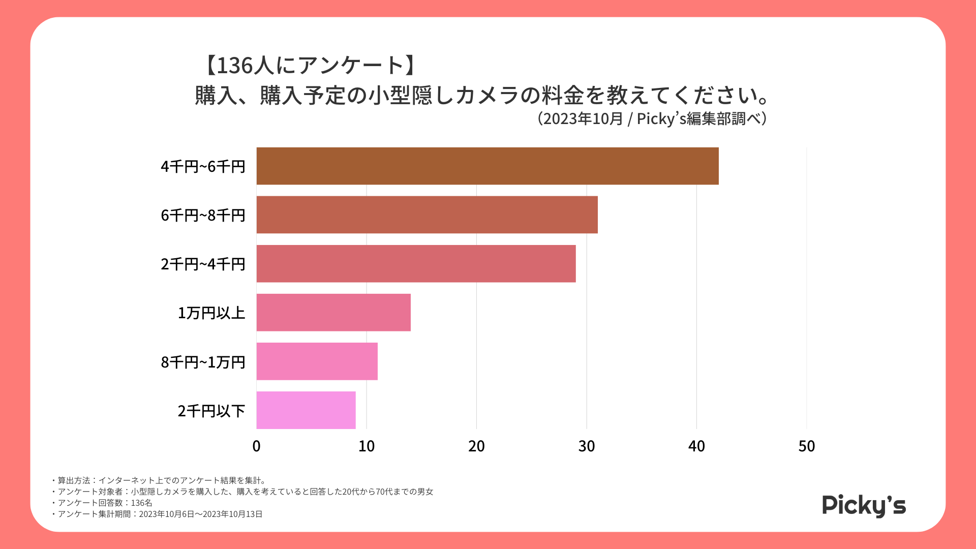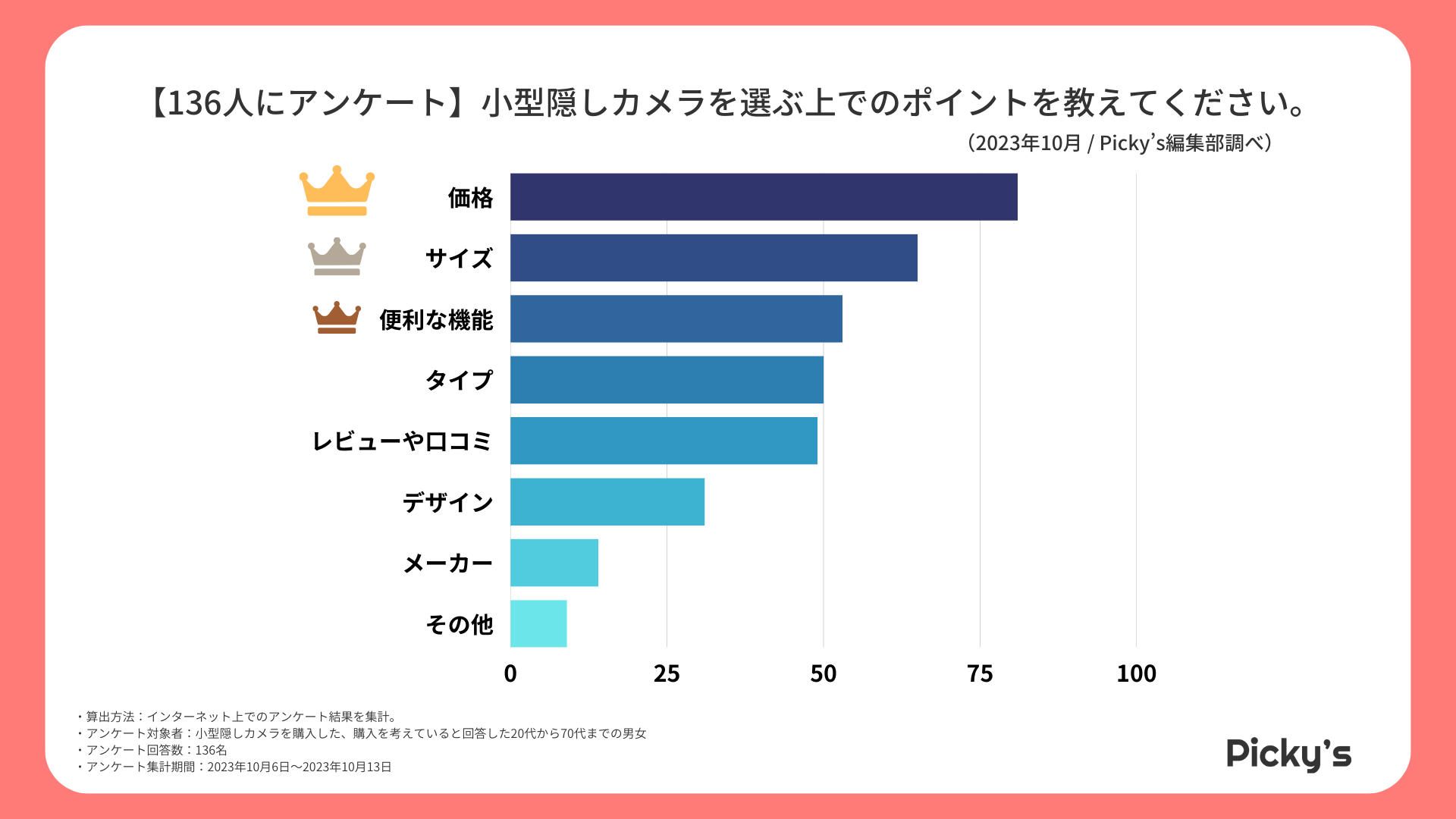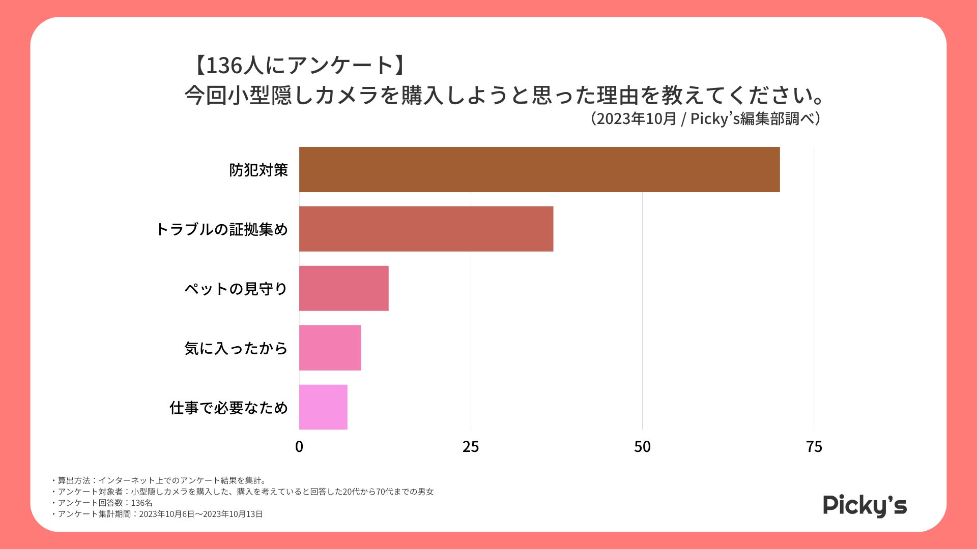 「Picky’s」は、インターネットショッピングにおいて、購入前に試せない・選ぶべきものがわからないという課題の解決を目標に、あらゆる商品のおすすめランキングや検証レビューを紹介するサイトです。このたびPicky’s(https://rentry.jp/note/)では、小型隠しカメラについてインターネット上でアンケート調査を行いましたので発表いたします。