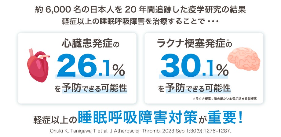 さらにSASは、高血圧、糖尿病、虚血性心疾患などのリスクを高めることが報告されています。約6000名の日本人を20年間追跡した疫学研究では、軽症以上のSAS治療により心疾患発症の26.1%、ラクナ梗塞発症の30.1%を予防できる可能性が示唆されました※2。このことからも、SASの早期発見・早期治療は特に運輸業界において重要な課題です。