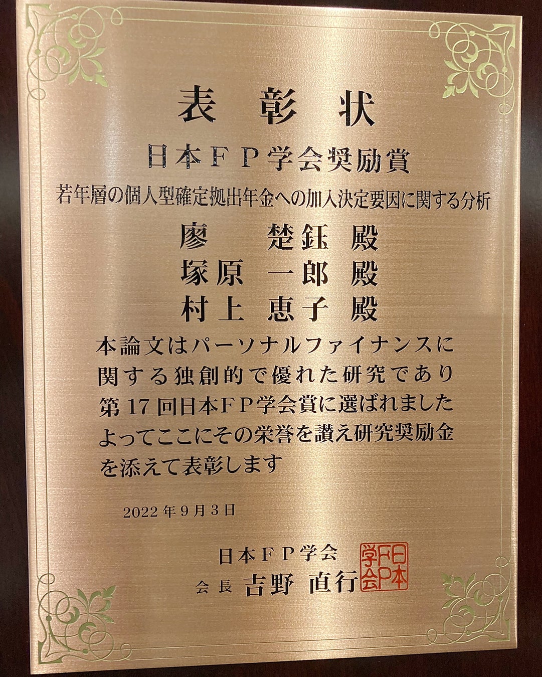 県立広島大学大学院(学長:森永 力,広島市南区)総合学術研究科 情報マネジメント専攻修了生の廖楚鈺さん,情報マネジメント専攻の塚原一郎義治准教授,専攻長の村上恵子教授の論文が,第17回日本FP学会賞において,日本FP学会奨励賞を受賞しました。