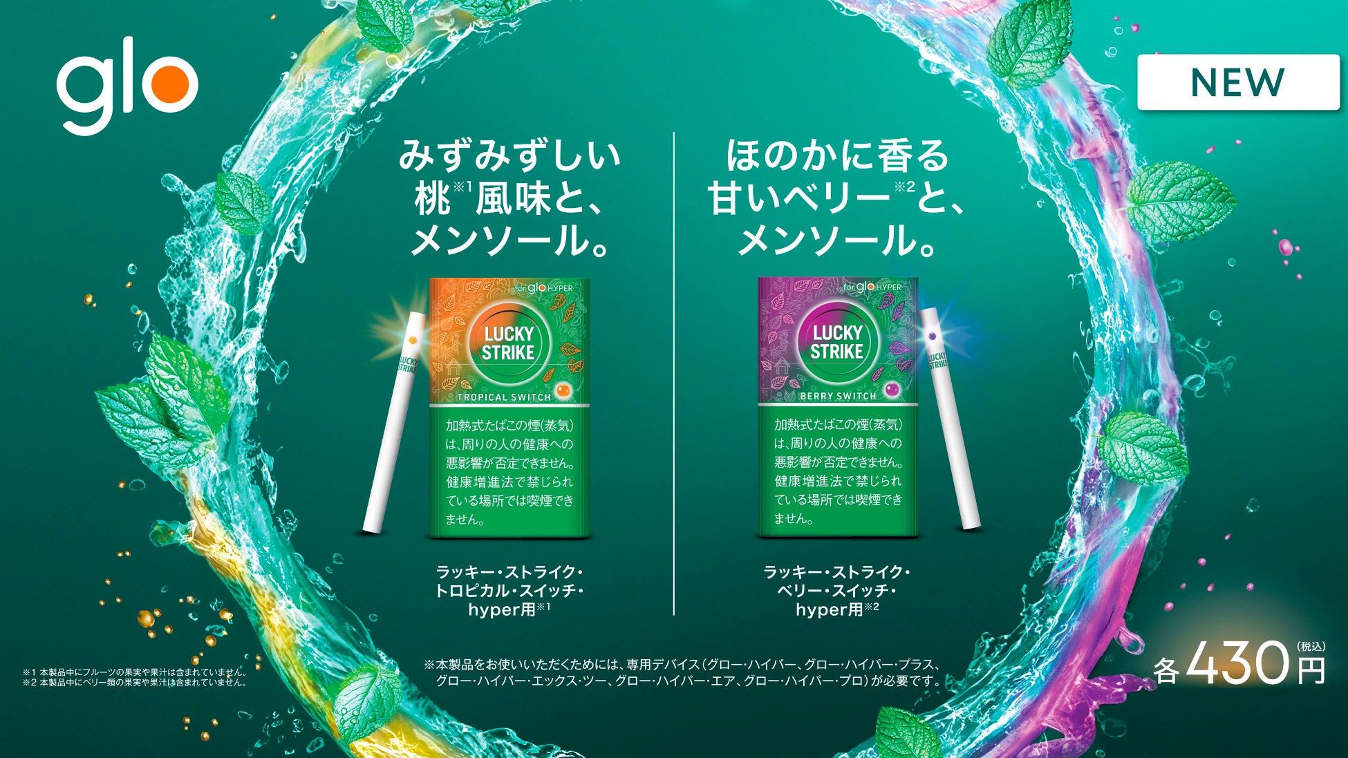 たばこ本来の伝統的な味わいを特長とし、1871年の誕生以来、150年以上にわたって多くのお客様に愛されてきた「ラッキー・ストライク」。2021年からは加熱式たばこglo™ HYPER専用のスティックシリーズとしても展開し、その奥深い風味を引き継いできました。この度、glo™ HYPER用「ラッキー・ストライク」シリーズから、スイッチフレーバーを採用した「ラッキー・ストライク・ベリー・スイッチ・hyper用」と「ラッキー・ストライク・トロピカル・スイッチ・hyper用」を全国の主要コンビニエンスストア(※1)、主要スーパーマーケット(※1)、たばこ取扱店(※1)、glo™ & VELOオフィシャルオンラインショップにて2025年2月10日(月)から発売します。