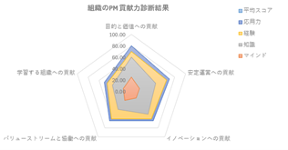 組織への価値貢献を5つの要素(目的と価値への貢献、安定運営への貢献、イノベーションへの貢献、協働・バリューストリームへの貢献、学習する組織への貢献)で可視化。教育計画や組織戦略の検討に直結。