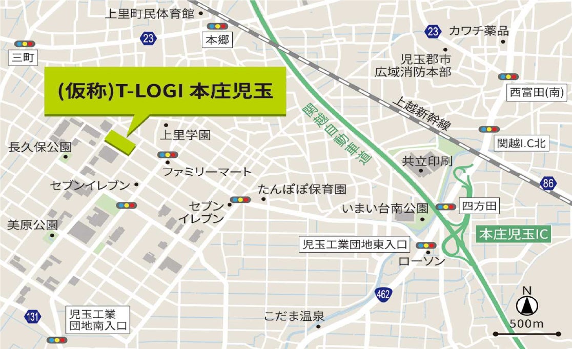 当事業の第一弾となる「(仮称)T-LOGI本庄児玉」(以下「本施設」)は、BTS型物流施設(※1)として埼玉県児玉郡上里町にて開発中です。関越自動車道「本庄児玉IC」より約3.3kmに位置し、都心部と郊外の生産拠点の両方にアクセスしやすい立地にあります。開業は2022年11月の予定で、吉見グループ株式会社(本社:埼玉県熊谷市、代表取締役社長:大久保 直政、以下「吉見グループ」)に一括賃貸することが決定しています。