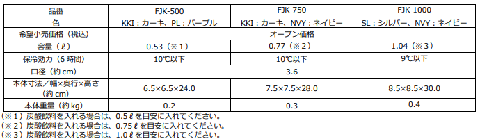 『サーモス 保冷炭酸飲料ボトル(FJK-500/750/1000)』 仕様一覧