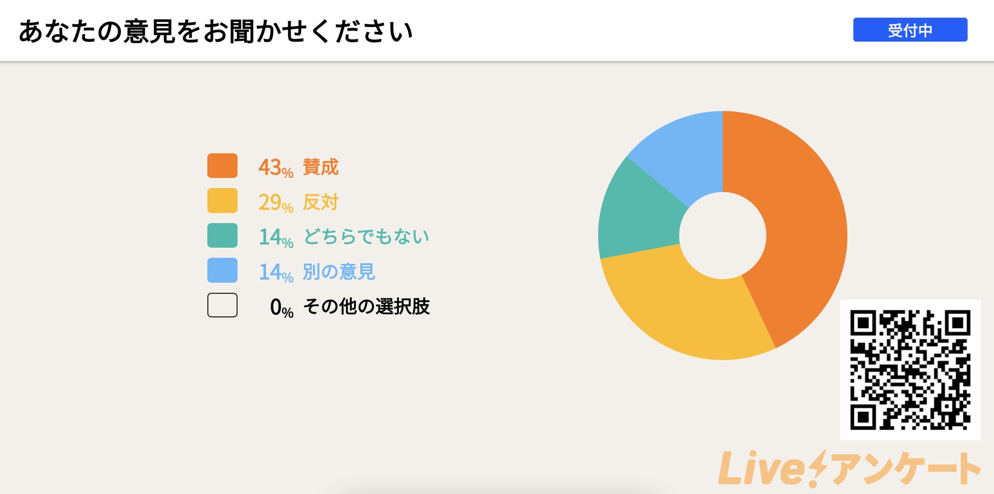 リアルタイム投票は、選択肢の順位が一瞬で可視化できることが何よりも重要ではありますが、横棒だけの表示ではなく割合で表現する場面は多数存在しており、そのような場面においては従来の横棒グラフより「円グラフ」の方が適しているため、円グラフを選択できるようアップデートいたしました。