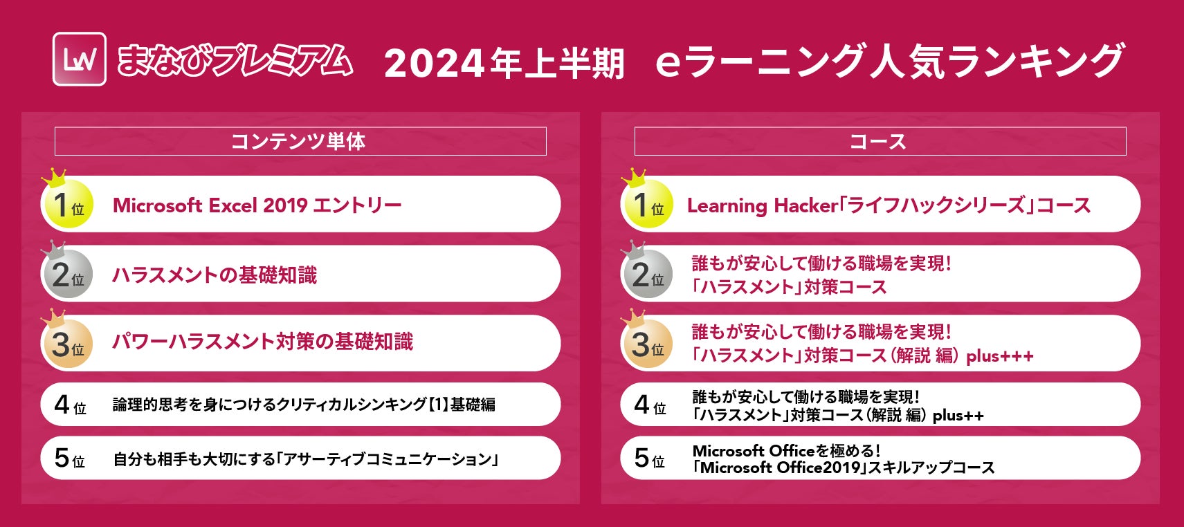 2024年度上半期は、これまでも受講の多かったMicrosoft Excelやクリティカルシンキングなど、実務能力を高める教材に人気が集まった一方、ハラスメントに関する教材やコースが上位に入り、近年のハラスメント対策への関心の高さがうかがえました。またコース部門では「まなびプレミアム」だけで提供しているライトワークスのオリジナルコンテンツ「Learning Hacker」の中から、ビジネスパーソンにライフ(生活や人生)を充実させる方法を提案する「ライフハックシリーズ」が第1位にラインクインしました。