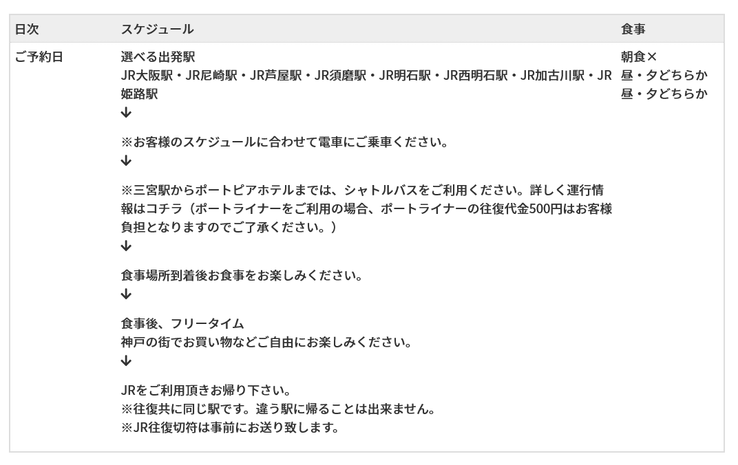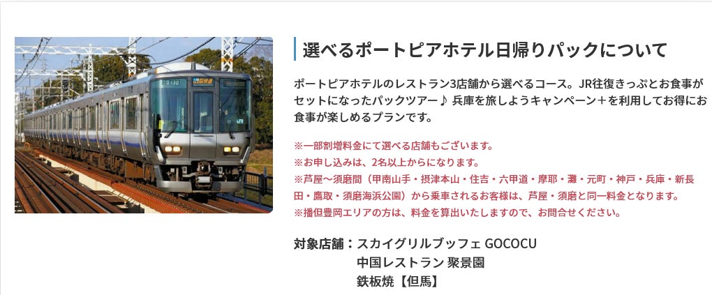 ポートピアホテルのレストラン3店舗から選べるコース。JR往復きっぷとお食事がセットになったパックツアー♪ 兵庫を旅しようキャンペーン+を利用してお得にお食事が楽しめるプランです。