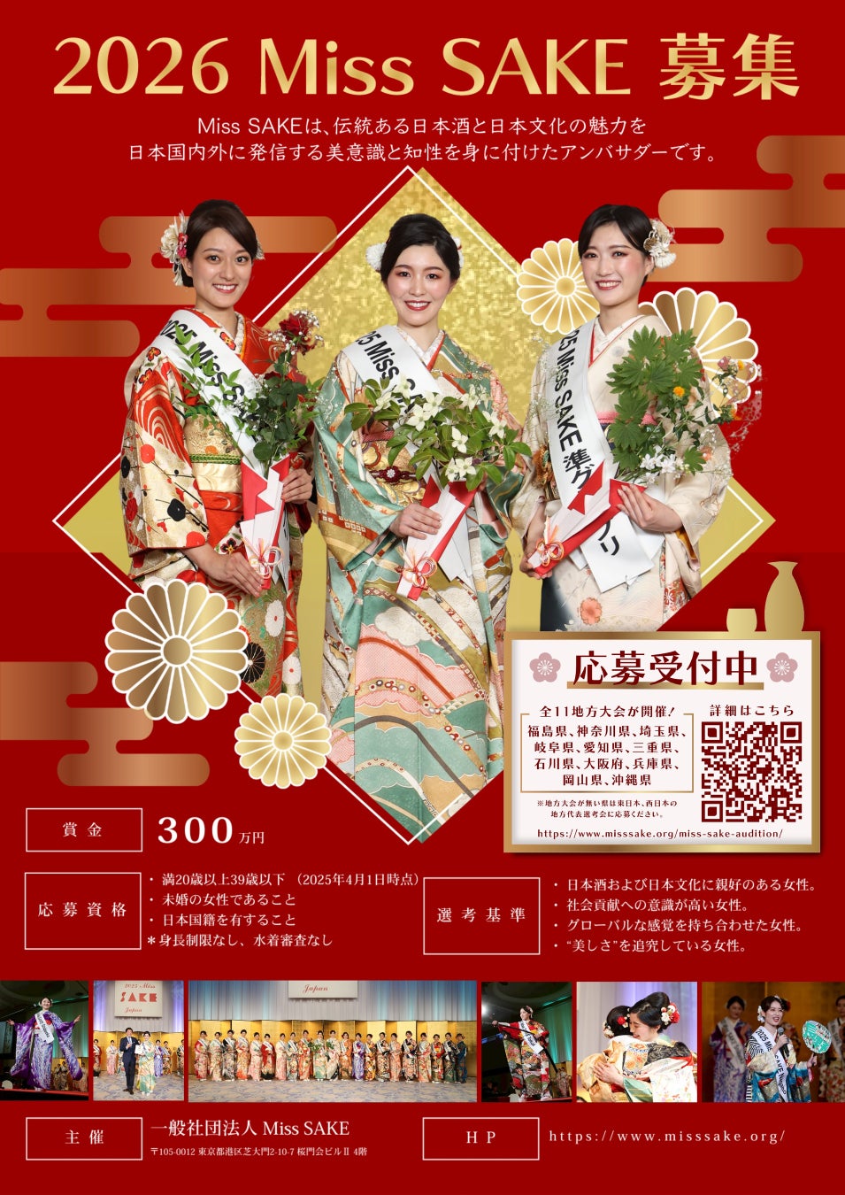 このたび一般社団法人Miss SAKE (〒108-0075東京都港区芝大門二丁目10番7号 桜門会ビルⅡ4階、代表理事 大西美香)は日本酒のアンバサダーである「2026 Miss SAKE」の募集を開始します。