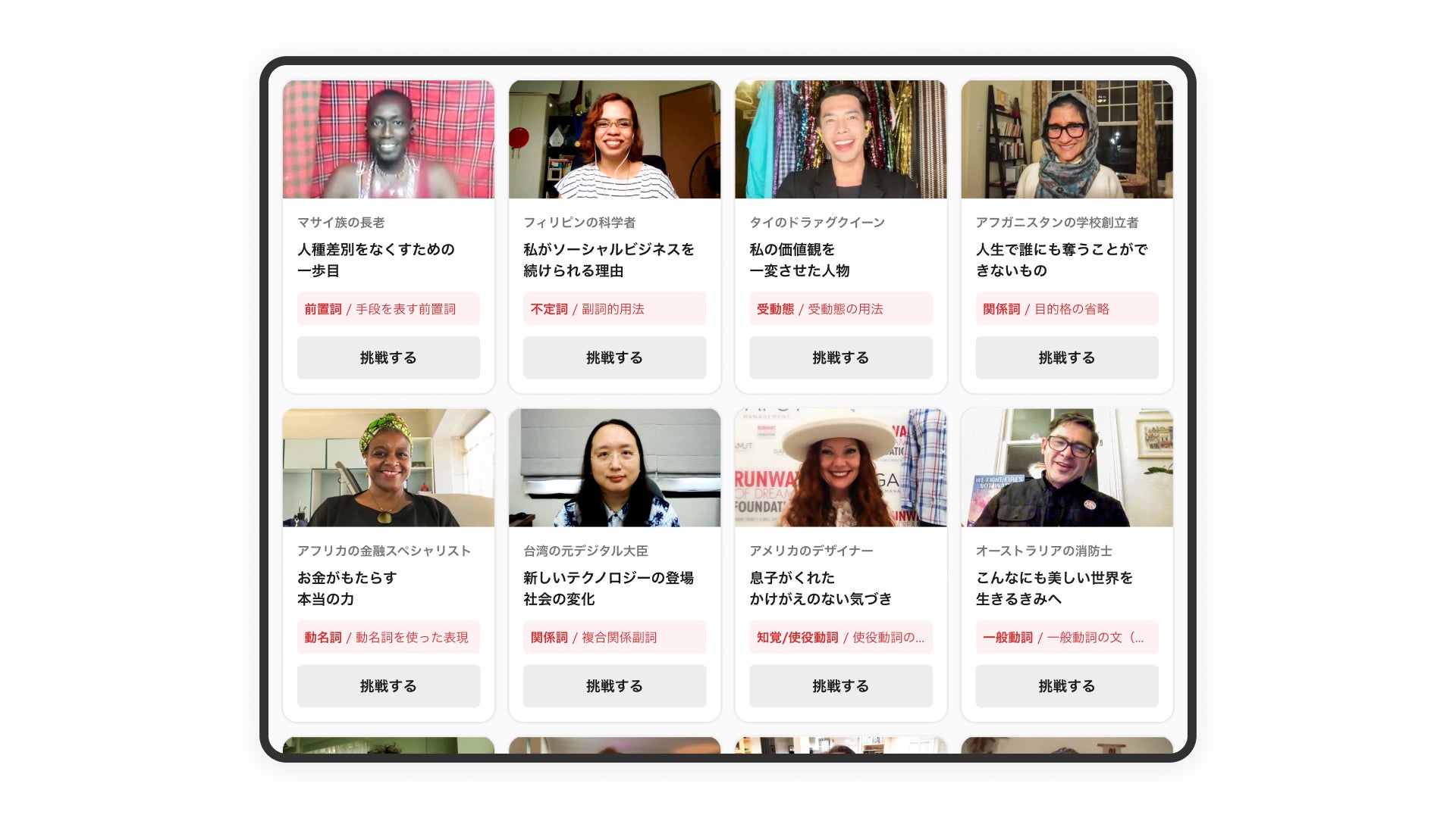 Inspire High Englishには、世界中の多様な大人(ガイド)が登場します。オーストラリアの消防士、マサイ族の長老、アフガニスタンの学校創立者、タイのドラァグクイーン、フィリピンの科学者など、さまざまな文化や価値観・背景を持つガイドのメッセージを“生きた英語”で受け取ることで、「英語をもっと聞き取れるようになりたい」「自分の考えを英語で伝えたい」という好奇心や学ぶ意欲を引き出します。