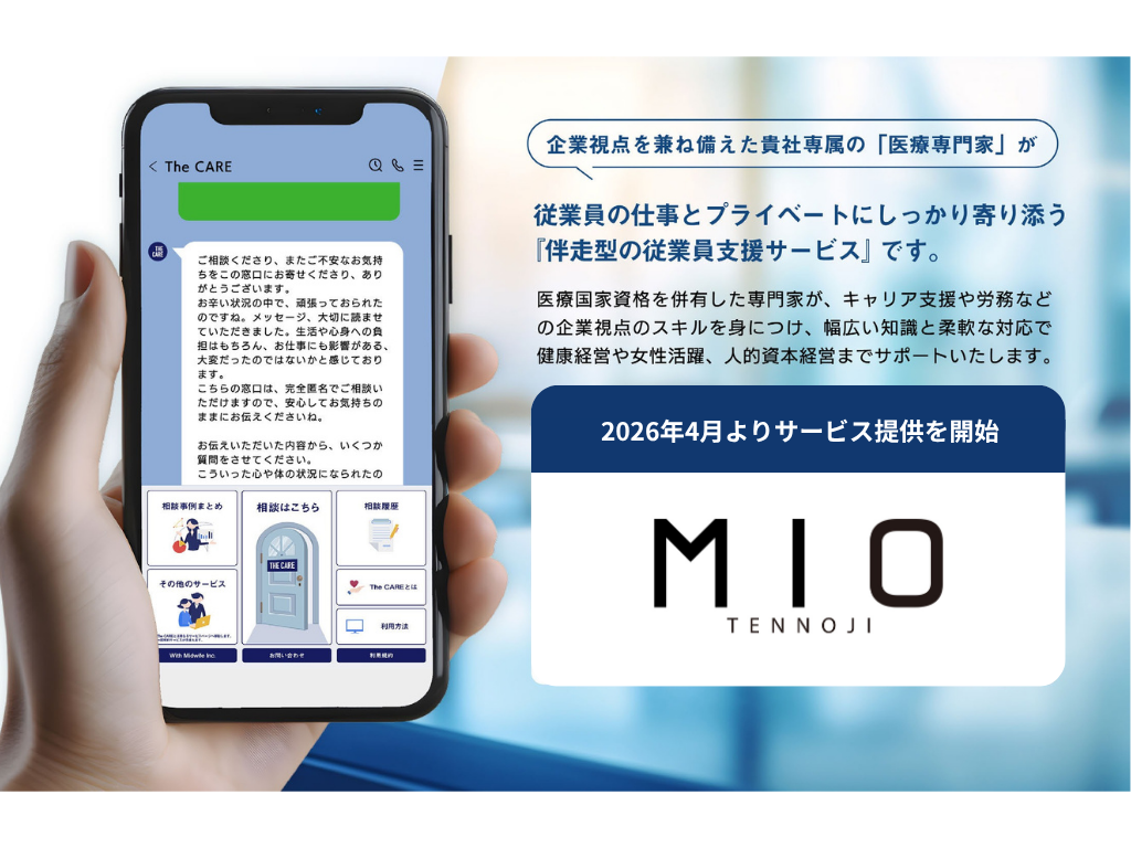 株式会社With Midwife(本社:大阪府大阪市、以下With Midwife)が提供する健康と子育ての従業員支援プログラム「THE CARE」が、JR西日本SC開発株式会社(本社:大阪府大阪市)が運営する商業施設「天王寺MIO」に導入されたことをお知らせいたします。