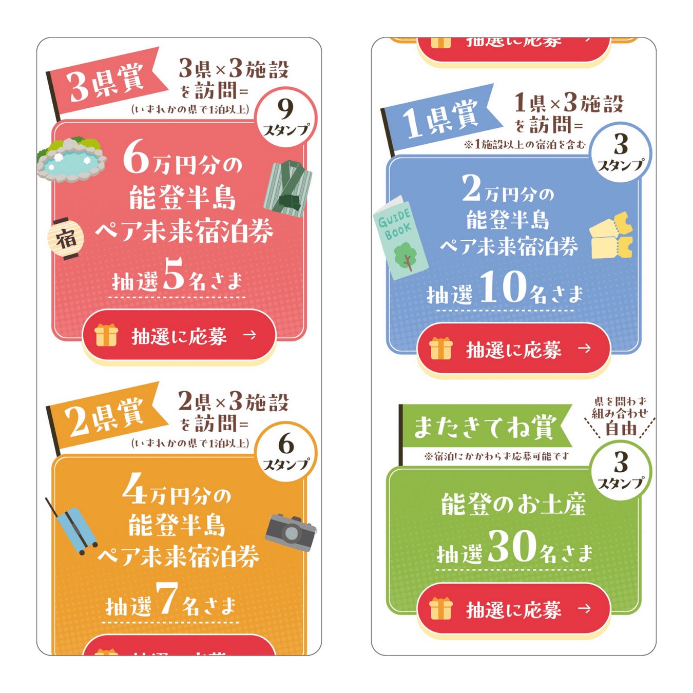 ・キャンペーン期間中、3県賞・2県賞・1県賞・またきてね賞についての応募は各賞につきお一人様1回限りです。(最大4回)