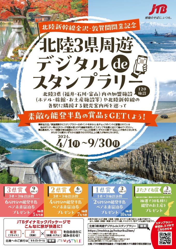 そこで、北陸の魅力を広く発信し、北陸全体の観光振興に一石を投じることができないかと考え、賞品として北陸の観光復興への祈念を込めた「能登半島ペア未来宿泊券」や「能登のお土産」を選定した『北陸3県周遊デジタルdeスタンプラリー』を実施することといたしました。