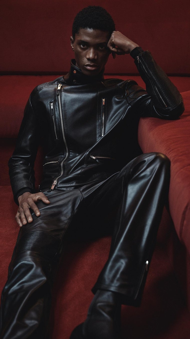 本コレクションの根底には、ルドヴィック・ド・サン・セルナンの一切妥協のないデザイン哲学が息づいています。それらのアイテムは、視覚だけでは語り尽くせない、触れ、纏うことで真価が立ち現れるプロダクトです。艶を湛えたウールやシルクダッチェスサテンで仕立てた豊かなテーラリング、そして贅沢にワックスを施したストーンウォッシュデニムが揃います。また、ルドヴィックのレザーへの卓越したサヴォアフェールを体現するのが、しなやかなカーフスキンで仕立てられたコート、パネルボンバージャケット、そして多様なフィットのトラウザーです。さらに、ジェットブラックのヘアカーフレザーを使用したカーコートは、このコレクションを象徴する一着として際立ちます。