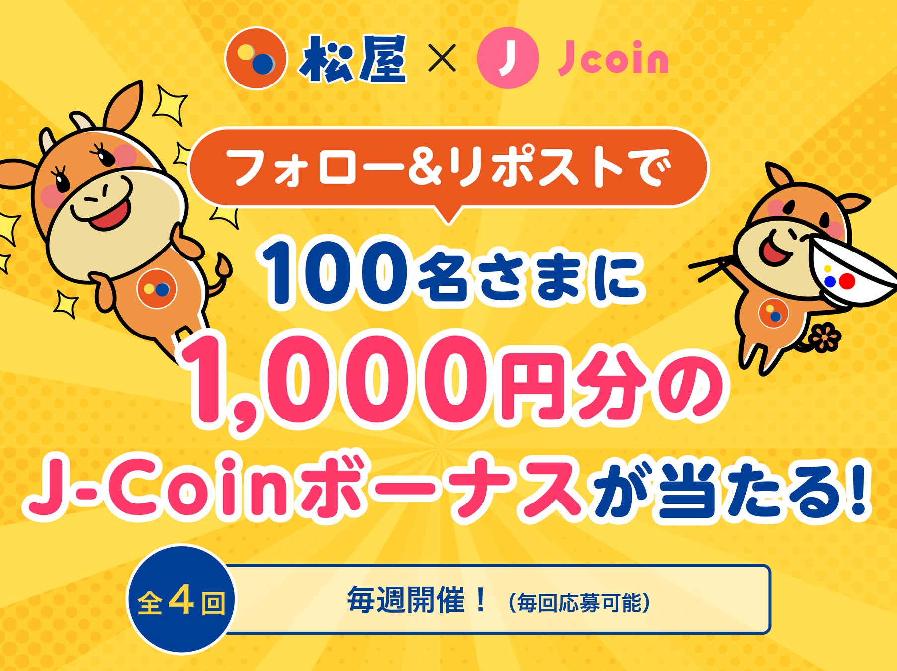 J-Coin Pay(@jcoinpay)と松屋(@matsuya_foods)の公式X(旧Twitter)アカウントをフォローし、指定のキャンペーン投稿をリポストいただいた方の中から、毎回100名様に1,000円分のJ-Coinボーナスが抽せんで当たります。期間中全4回にわたり実施され、複数回ご参加いただくこともできます。