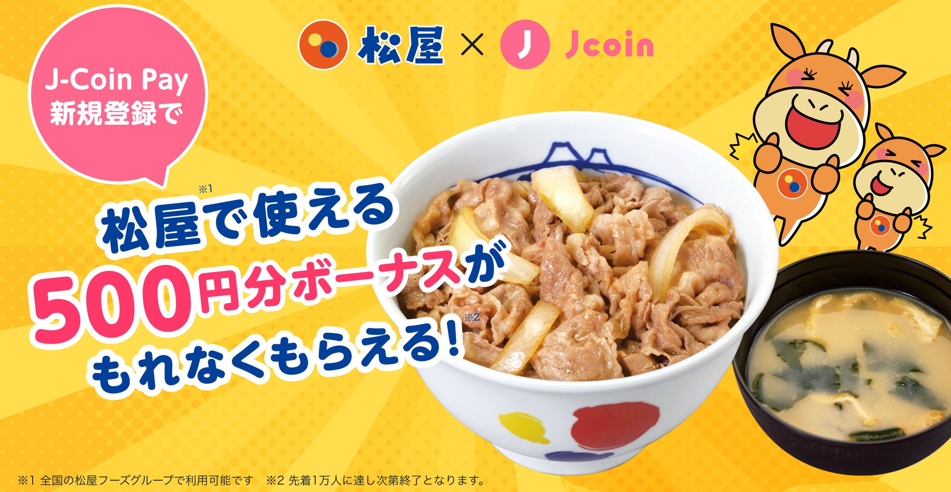 先着1万名さまに松屋グループ限定で使用できるJ-Coinボーナス500円分をプレゼント