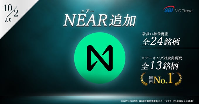 SBI VCトレード株式会社(本社:東京都港区、代表取締役社長:近藤 智彦、以下「当社」)は、2024年10月2日(水)当社システムメンテナンス終了後より、「ニアー(NEAR)」の取扱いを開始することをお知らせいたします。これにより当社の取扱い暗号資産は全24銘柄となります。ステーキング対象は全13銘柄となり、対象銘柄数は引き続き国内No.1 ※となります。