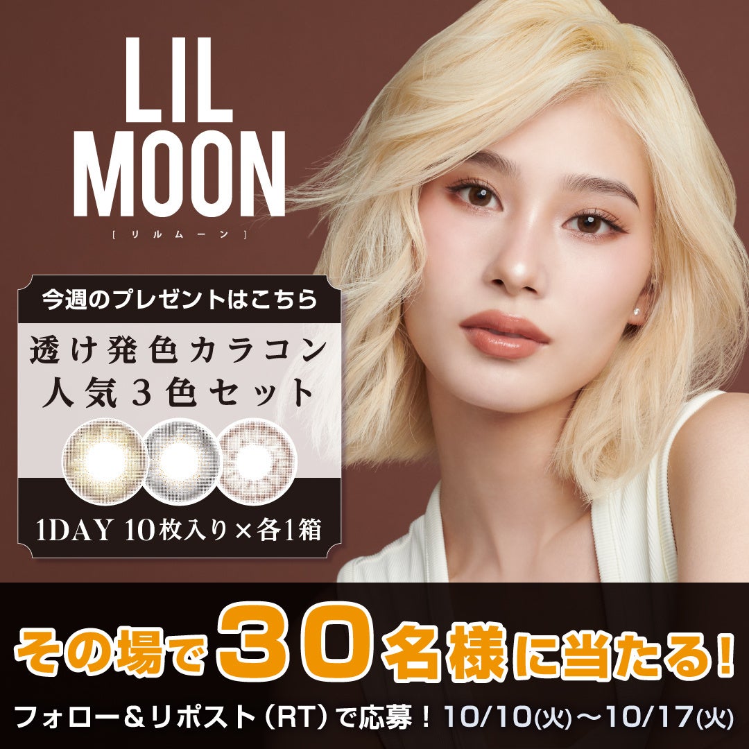 『LIL MOON(リルムーン)』は、高発色なのにうるっと盛れる透明感レンズで主役級のきらめく瞳にみせるカラーコンタクトレンズブランドです。しっかりメイクに映える高発色レンズから、ふんわり印象チェンジできる透け発色レンズまで、どんな人もお気に入りが見つけられる豊富なカラーラインナップ。1DAY11種、1MONTH17種の展開でDIAや着色直径も幅広く選べます。