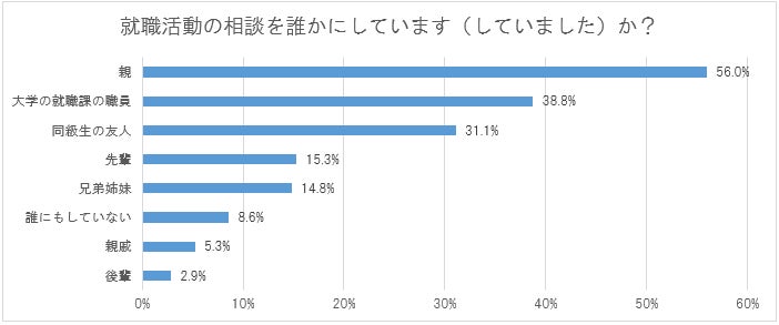 就職活動の相談相手について複数回答で聞いたところ、約9割の学生が誰かに相談をしていることが分かりました。相談相手としては、「親」56.0%、「大学の就職課の職員」38.8%、「同級生の友人」31.1%がトップ3で、過半数の就活生が両親に相談をしていました。相談相手とその理由について自由記述で聞いたところ、「親」については、社会人歴が長いことや人生の先輩であることなどが挙げられました。各相談相手について、「年齢が近く身内なので兄弟姉妹に相談している」という学生や、「就職活動に成功している友人にポイントを聞く」など、うまく周囲を頼りながら就職活動を進めていることがうかがえます。
