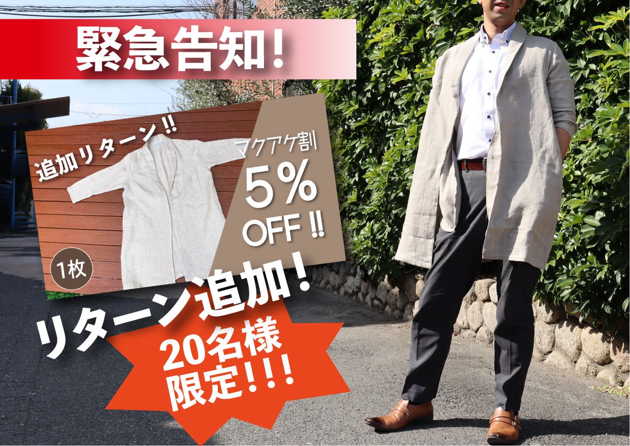 【おかげさまで全リターン完売!残り二日!】アタラシイものや体験の応援購入サービス「Makuake」にて開催中の、麻100%ワンマイルウェアが、大好評につき追加リターン決定!